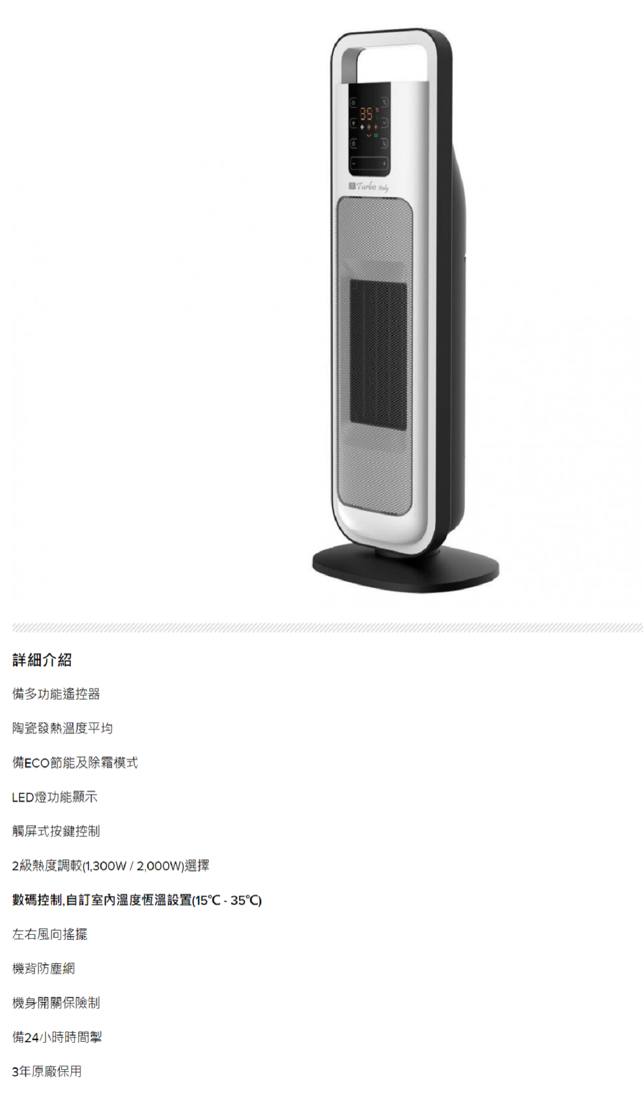 备多功能遥控器,备ECO节能及除霜模式,触屏式按键控制,2级热度调较(1,300W / 2,000W)选择,室内温度恒温设置(15℃ - 35℃),左右风向摇摆,机背防尘网,机身开关保险制,备24小时时间掣