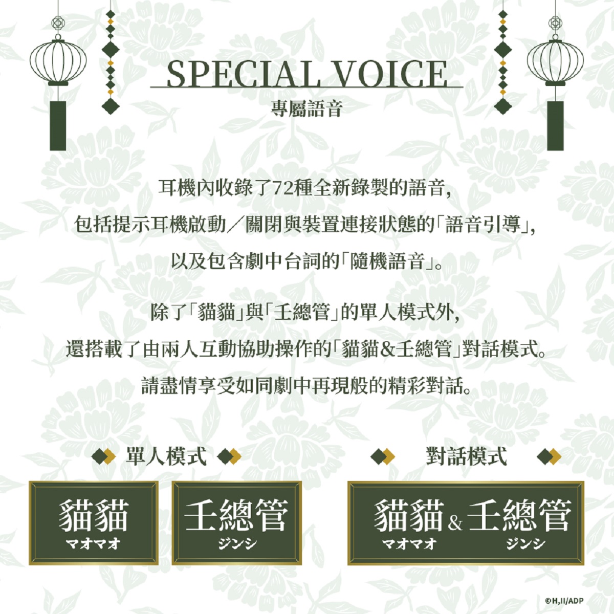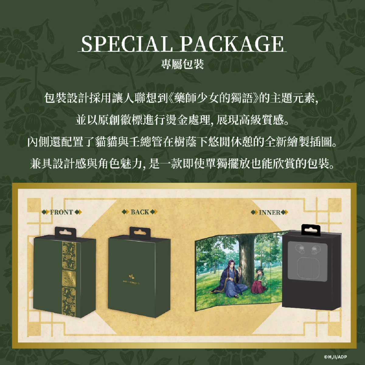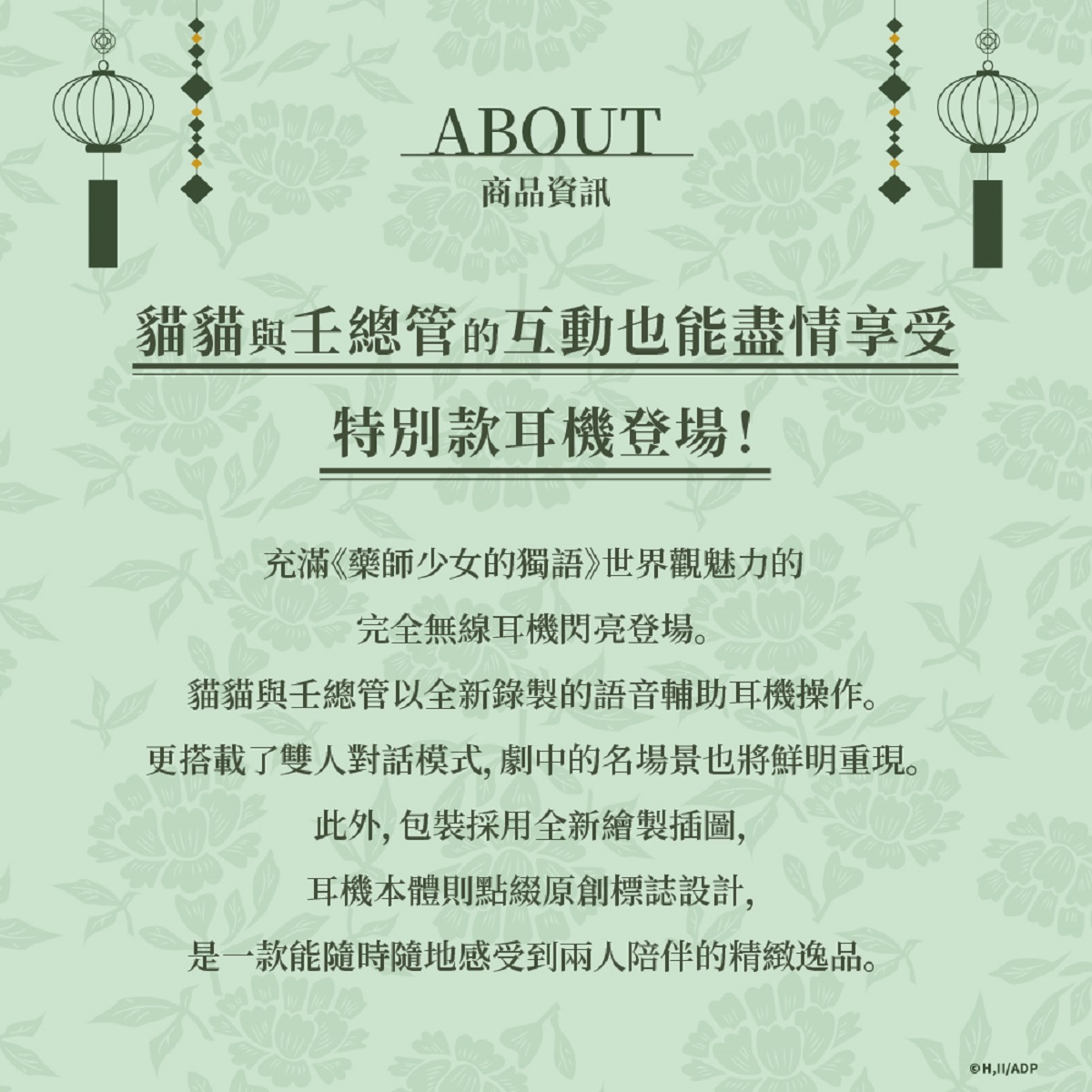 充满《药师少女的独语》世界观魅力的真无线耳机闪亮登场。猫猫与壬总管以全新录制的语音辅助耳机操作。更搭载了双人对话模式,剧中的名场景也将鲜明重现。此外,包装采用全新绘制插图,耳机本体则点缀原创标志设计,是一款能随时随地感受到两人陪伴的精致逸品。