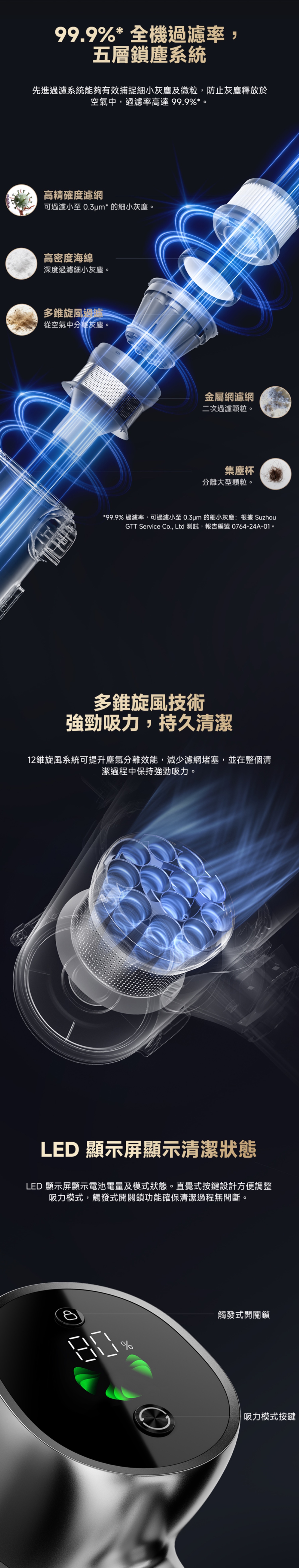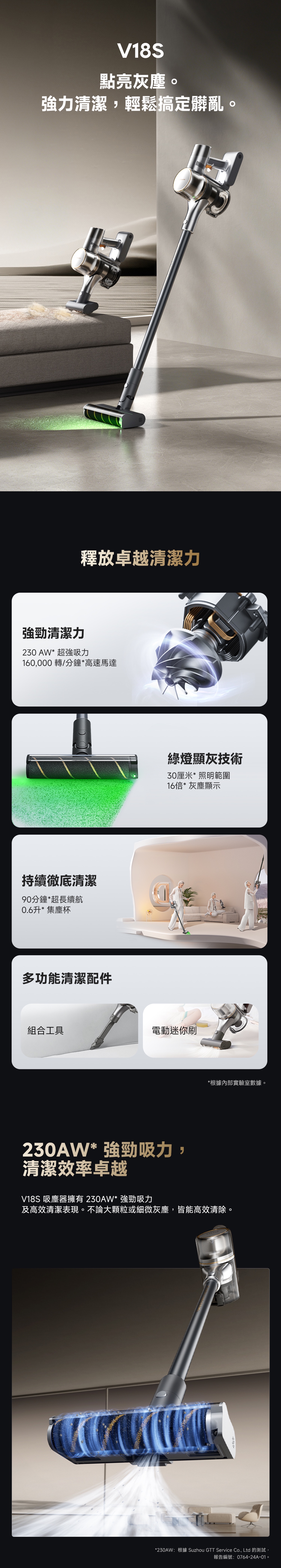 无线手提吸尘机,230AW强劲吸力,LED照明,LED显示屏显示清洁状态,90分鐘持久清洁,绿灯显灰技术