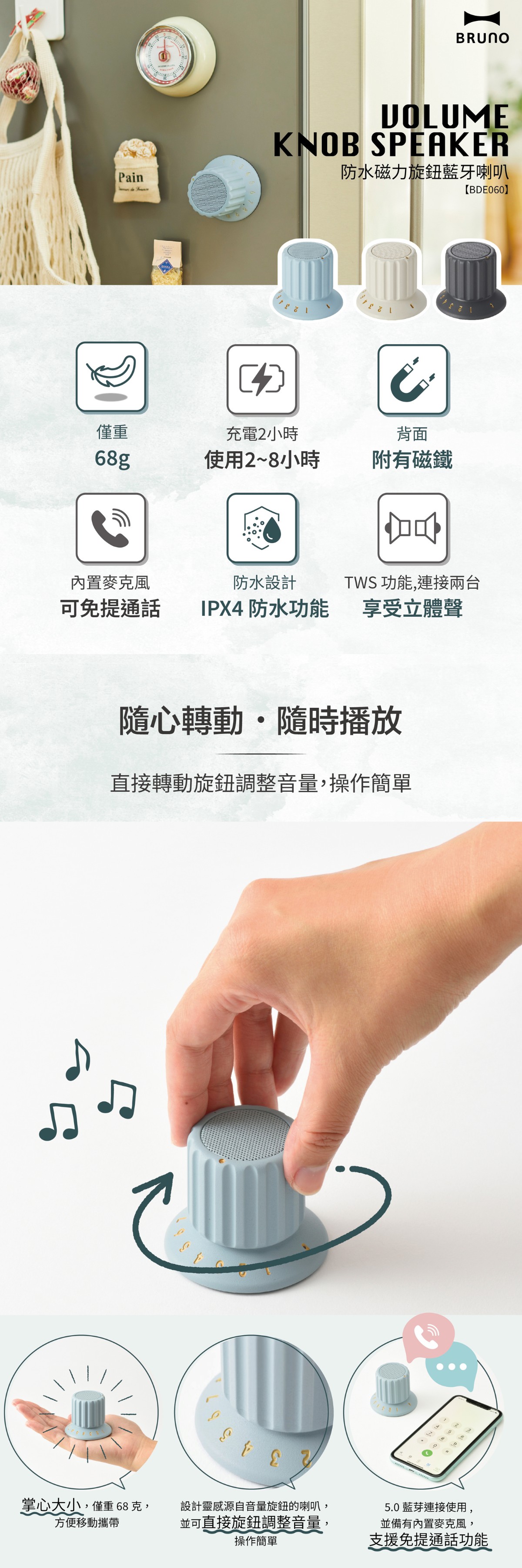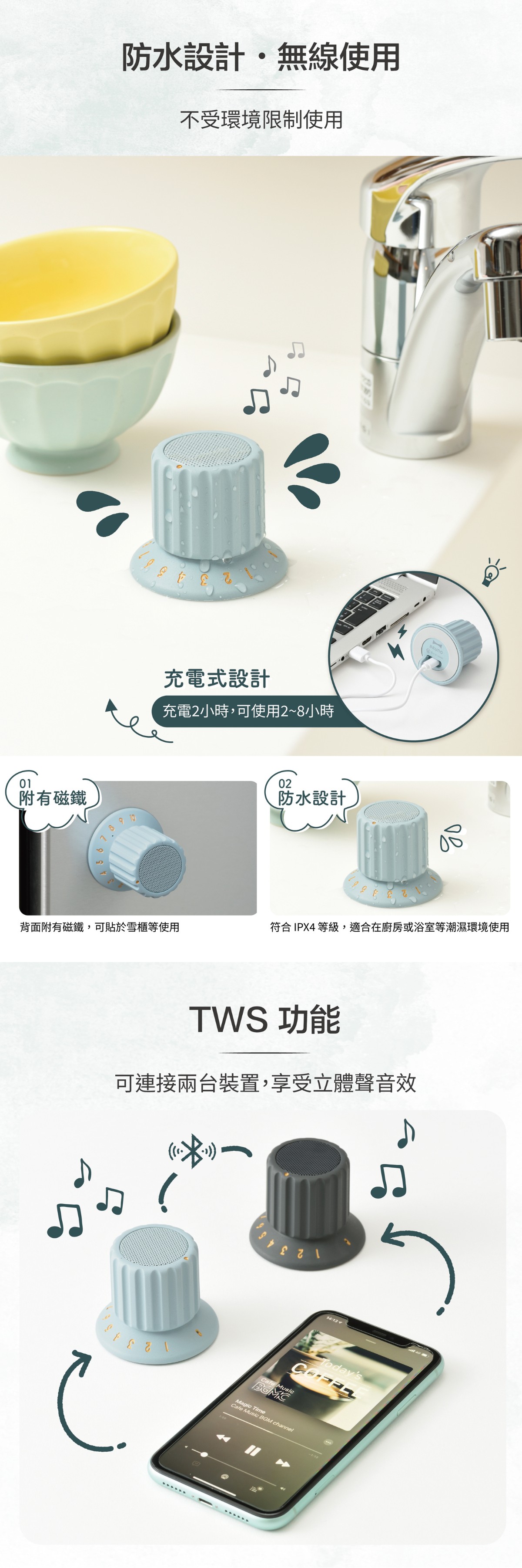 轻易控制音量: 旋转旋钮即可调节音量,操作简单/防水设计: 符合 IPX4 等级,适合在厨房或浴室等潮湿环境使用/磁性底座: 内建磁石,可吸在金属表面,如冰箱或其他家电/TWS 功能: 支援 True Wireless Stereo,可连接两台装置,享受立体声音效/免提通话: 内置麦克风,支援免提通话功能