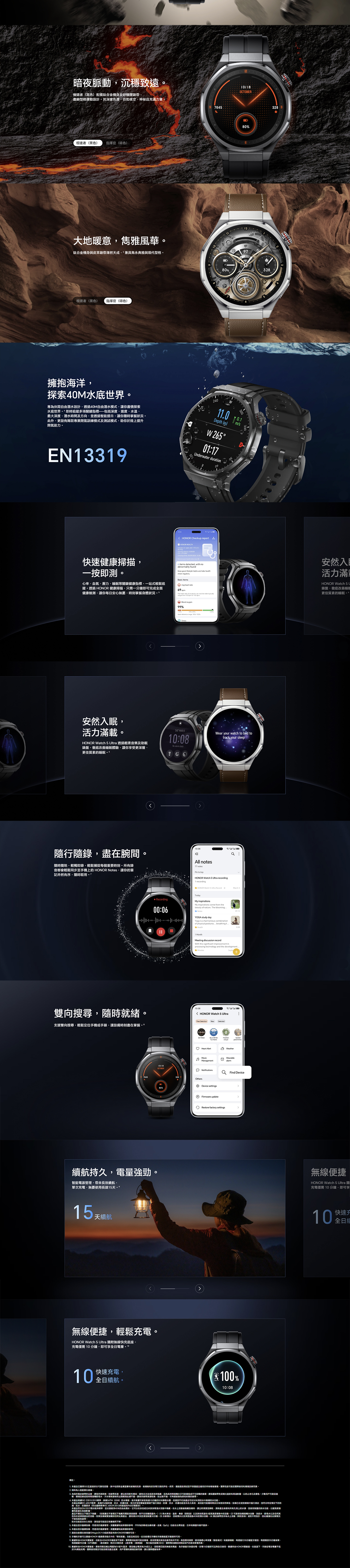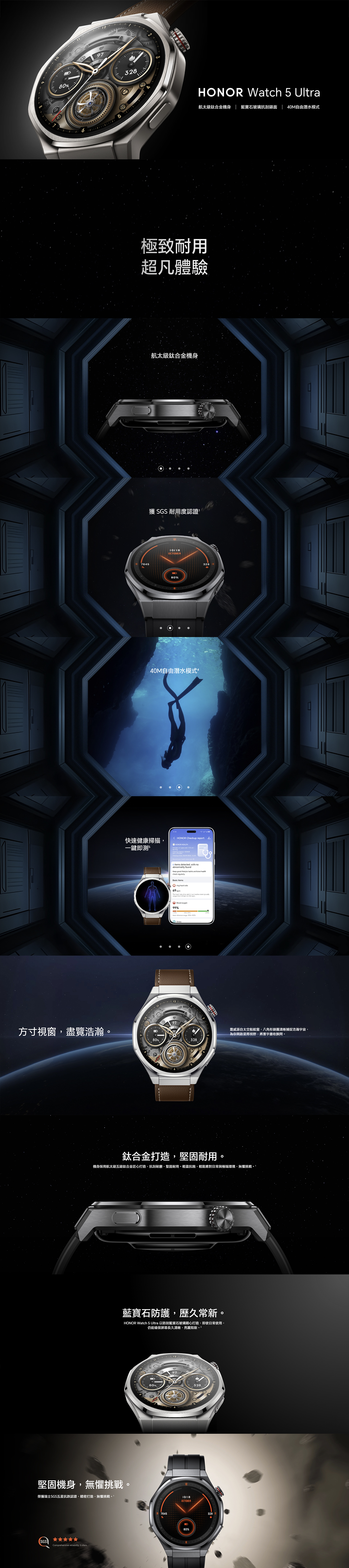 航太级钛合金机身 / 蓝宝石玻璃抗刮錶面 / 40M自由潜水模式 / 航太级合金外壳