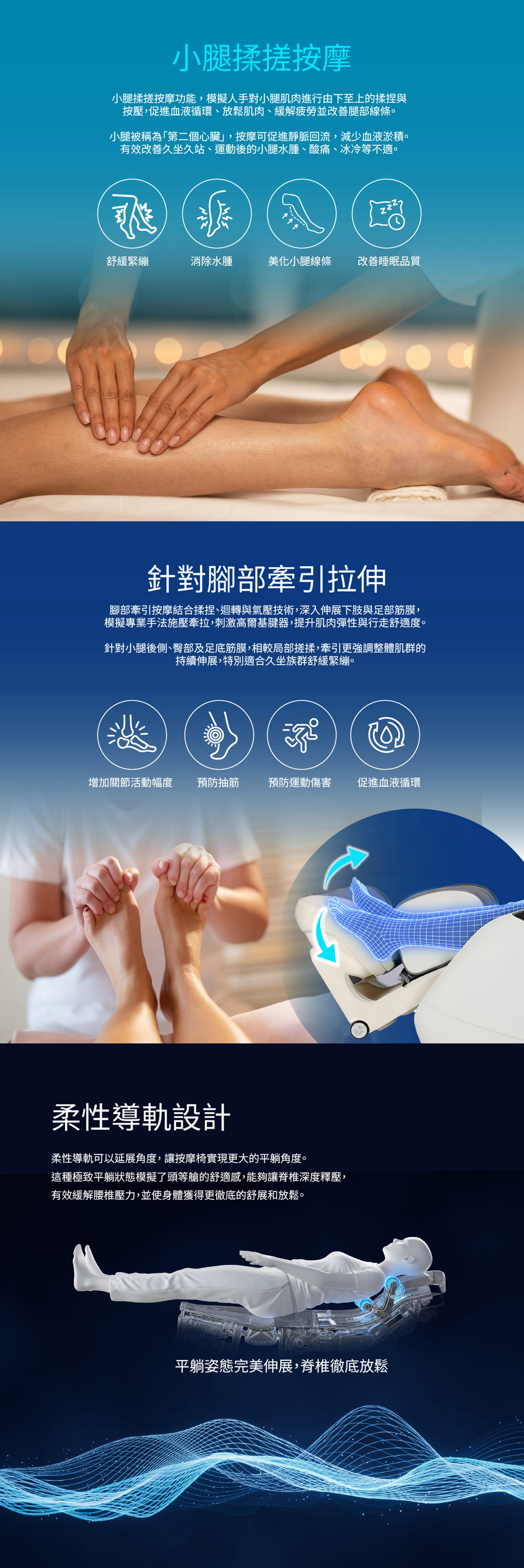 创新音波按摩体验,柔性导轨设计,8个音波按摩模式,配合揉捏、捶打、指压、拍打、推拿、脚部滚轮、气压等多种按摩手法