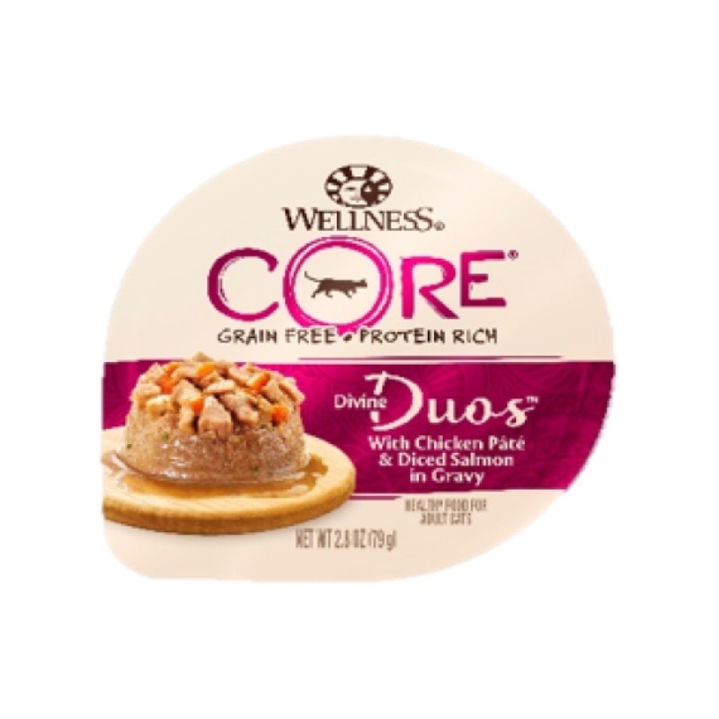 Wellness® CORE® Divine Duos™在一个杯子中结合了两个美味层! 这款无谷物富含蛋白质的膳食配有一层美味的肉酱,上面有第二层嫩肉切块,提供日常膳食体验。