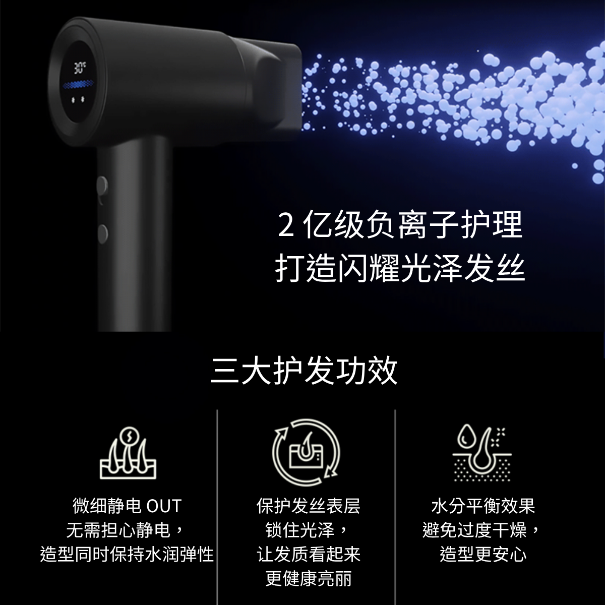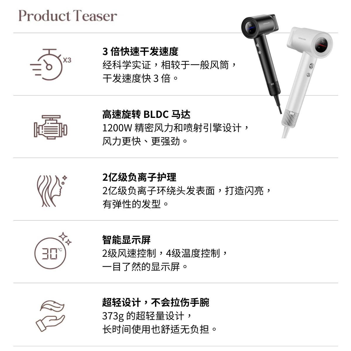干发速度提升3倍,经科学实证相较一般风筒更快速高效,节省宝贵时间。搭载1200W高速旋转BLDC无刷直流马达,结合喷射引擎式风道设计,风力集中强劲,迅速吹干每根发丝。释放2亿级高浓度负离子,包覆发丝表面,有效减少毛躁与静电,重塑闪亮有弹性的健康发型。配备智能数位显示屏,清晰易读,提供2段风速与4段温控,操作直觉便利。超轻量人体工学设计,机身仅重373克,长时间使用也不易造成手腕疲劳,造型更轻松。专为现代生活打造,兼具速度、护理与舒适,让你每天都能快速拥有完美发型。