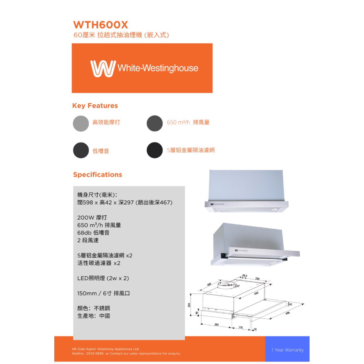 WHT600X 60厘米 拉趟式抽油烟机(嵌入式) / 高效能摩打 / 低嘈音 / 活性炭过滤网