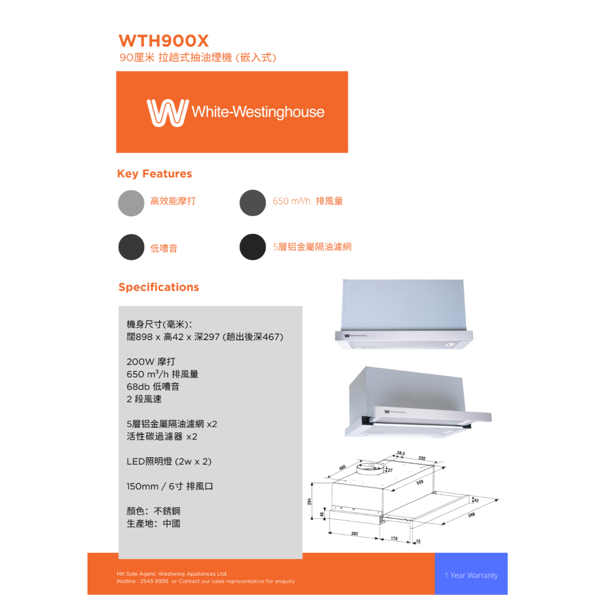 White-Westinghouse威士汀 WTH900X 拉趟式抽油烟机 嵌入式抽油烟机