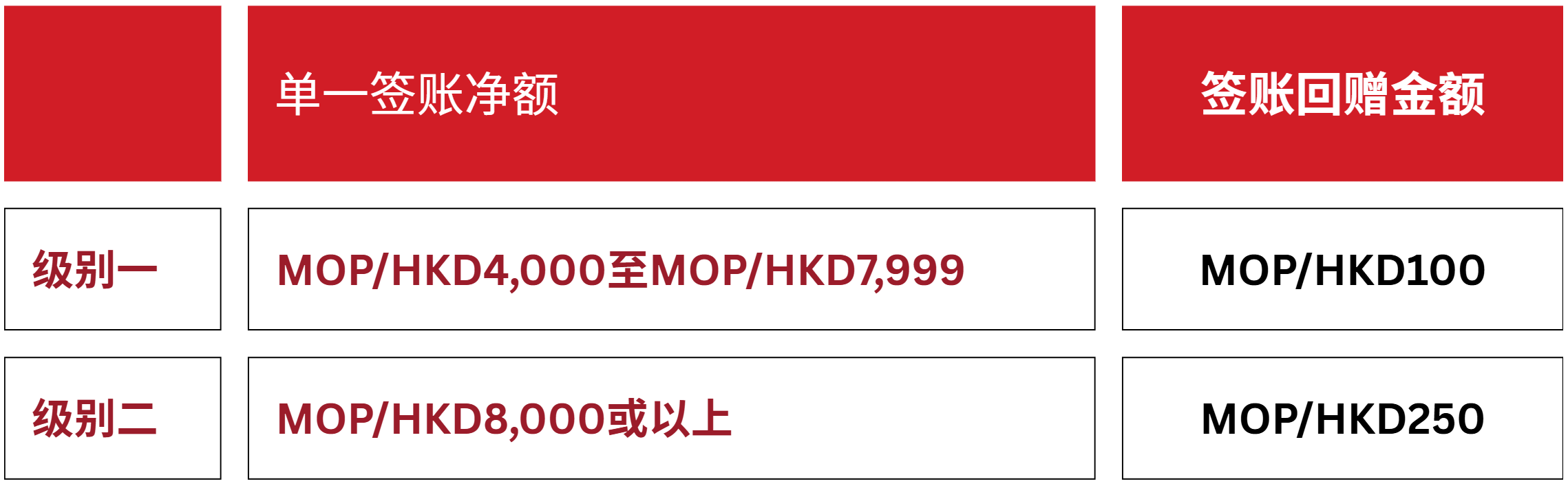 每位合资格客户于此推广最多可获澳门元/港币250元签账回赠。 每位客户只可享级别一或级别二之优惠一次。