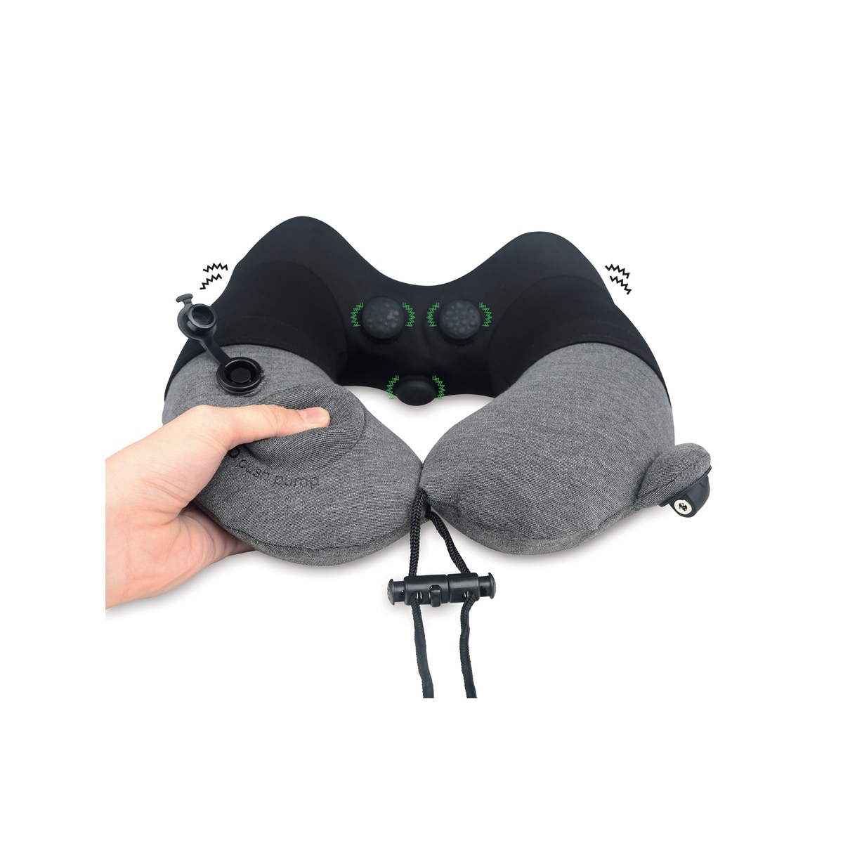 這款按摩頸枕是全球首款同時具備專利按壓式充氣裝置及按摩功能的智能頸枕 。充氣只需反覆按動按壓式充氣裝置,方便又衛生,省卻吹氣之不便。產品完全符合人體工學設計,按摩針對頸椎穴位的局部進行刺激按摩的按摩器 ,可調教不同按摩力度或定時器功能,有效消除疲勞,放鬆肌肉。折疊式收藏,適合外出旅遊 , 無論乘搭飛機,火車,汽車時使用 。