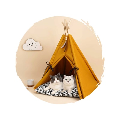 波浪紋寵物帳篷姜黃色尖頂帳篷,同深色嘅束帶窩墊形成強烈對比,為屋企帶嚟現感十足嘅視覺衝擊。防滑滴膠底底部採用防滑滴膠面料,防水防滑,可以放心主子嘅安全。