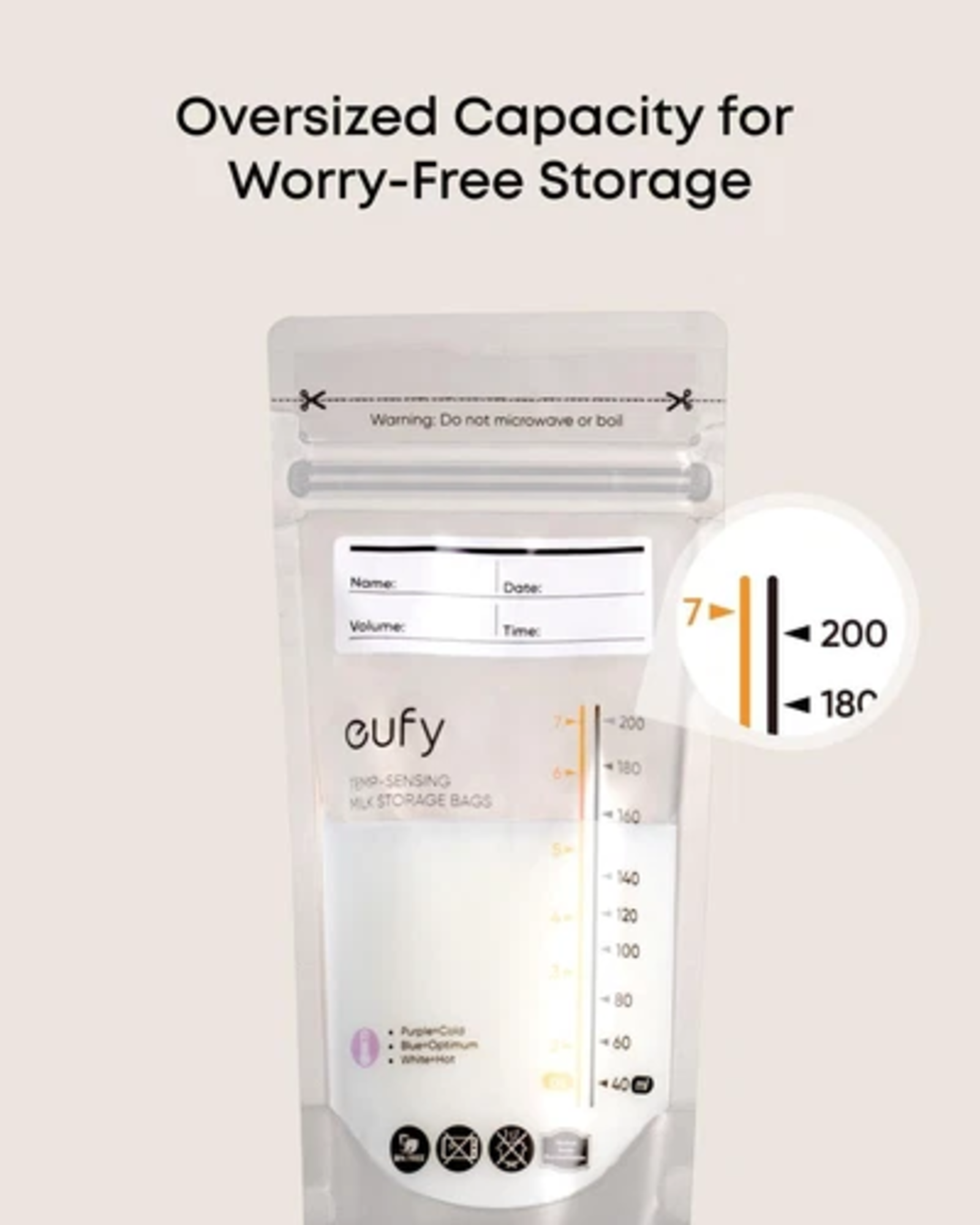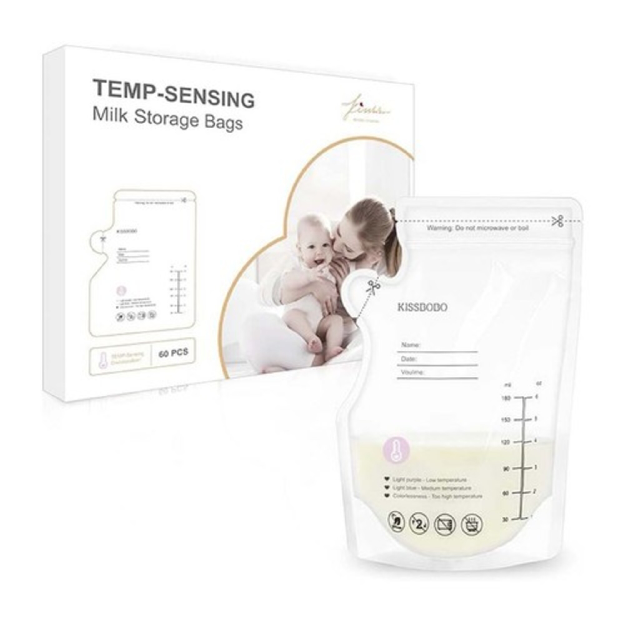 變色技術,立即查看母乳溫度:一眼即可了解母乳溫度。紫色表示太冷,白色表示太熱,藍色表示溫度適宜,適合餵食。密封牢固,滴水不漏:預先消毒加厚母乳袋,採用雙層密封縫線和雙拉鍊設計,有效保護母乳。只需用指尖按壓,直到聽到「咔噠」聲即可密封。