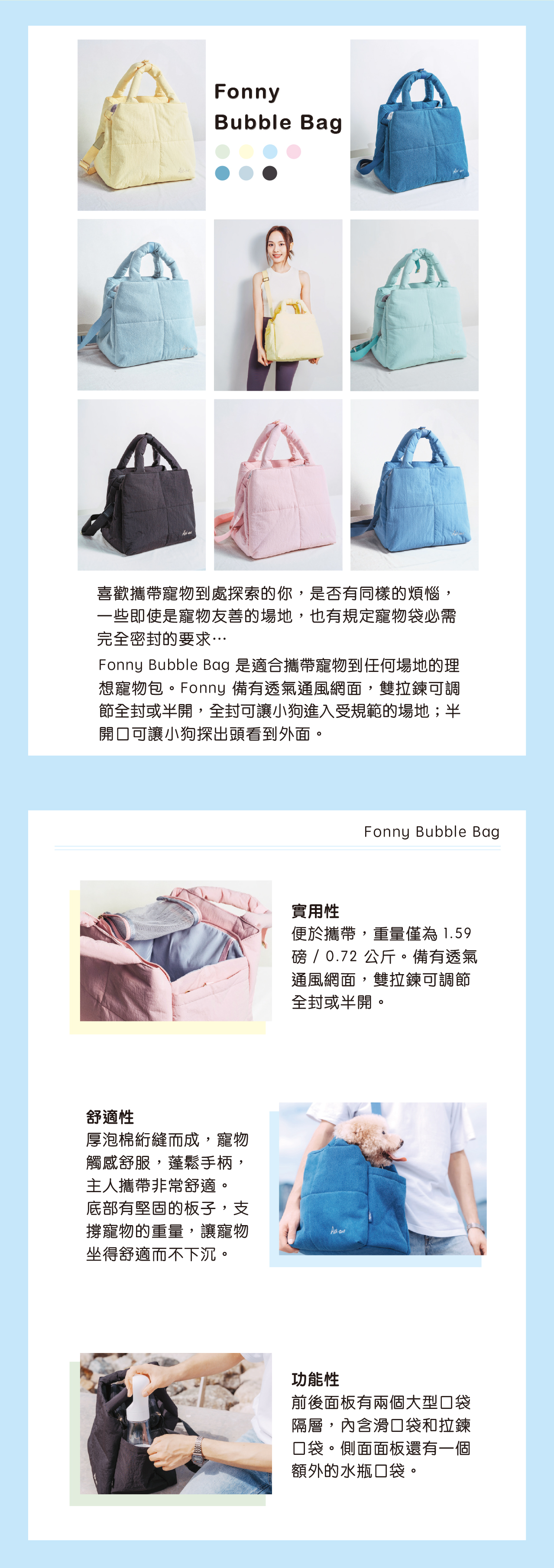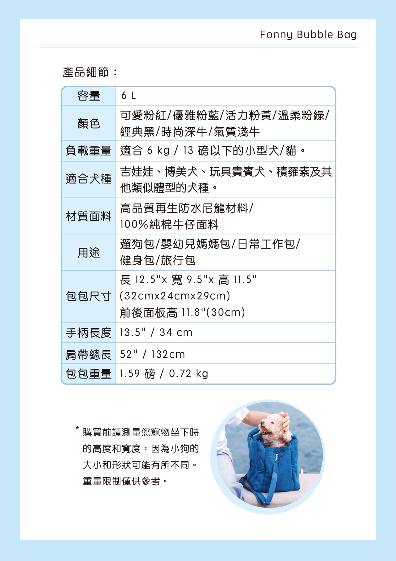尼龍/牛仔兩款可選,均輕便防水、易於清潔。尼龍款採用100%環保再生REPT面料,牛仔款則為100%純棉,舒適親膚。/兩側設有水瓶口袋,前後隱藏多隔層,含滑口袋與拉鏈袋,收納方便且外觀整潔。配備安全扣,防止寵物走失。/雙拉鏈設計可全封或半開,適應不同場景,自鎖拉鏈更安全。內部厚泡棉縫合,棉感內裏,提升舒適度。底部加厚支撐板,承重穩定。/淨重僅0.72kg,負載可達6kg,尺寸12.5"×9.5"×11.5",輕巧實用。