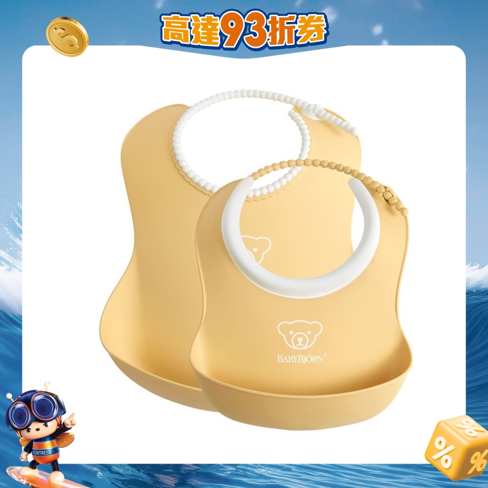 餵食嬰兒膠圍兜配備兩種不同尺寸,細膠圍兜適用於4-10個月的階段,而較大的膠圍兜適用於4個月以上的嬰兒。