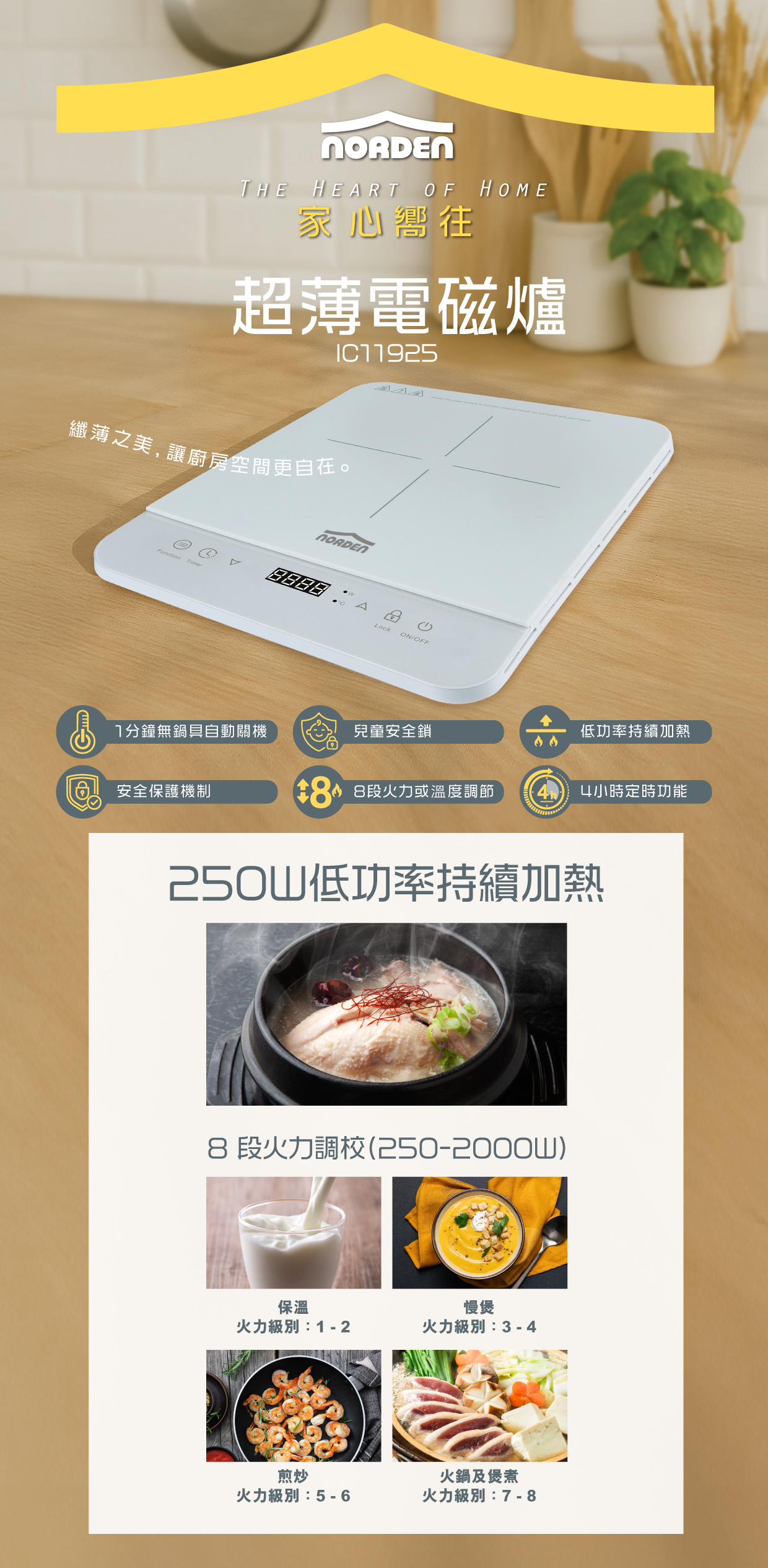 白色玻璃晶板 250W低功率持續加熱 8段溫度控制(80-240℃) 8 段火力調校(250-2000W) 4小時定時功能 LED數碼顯示 過熱斷電保護裝置 閒置自動關機功能 輕觸式按鍵控制