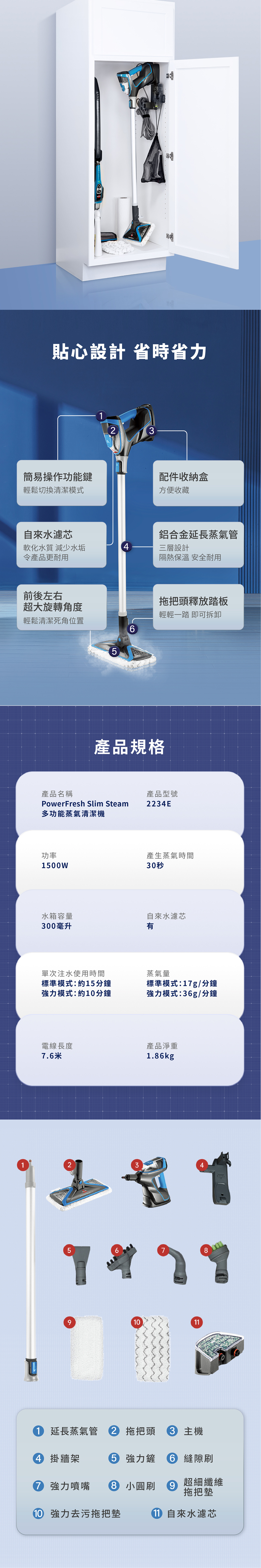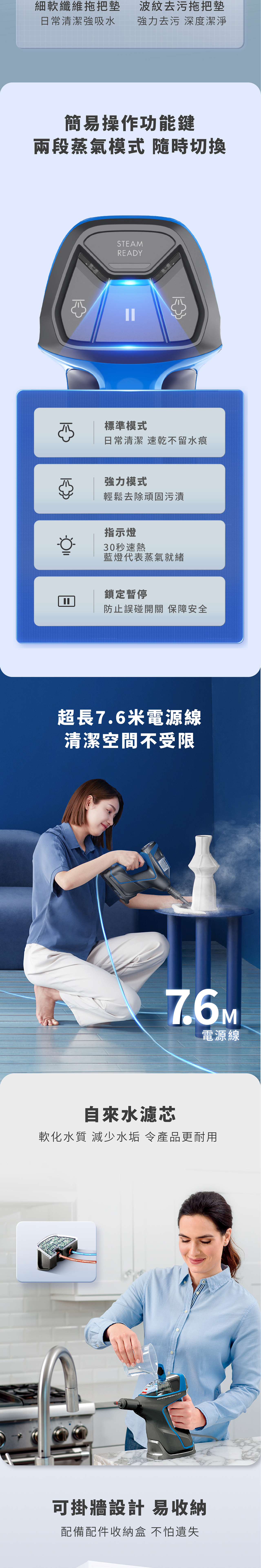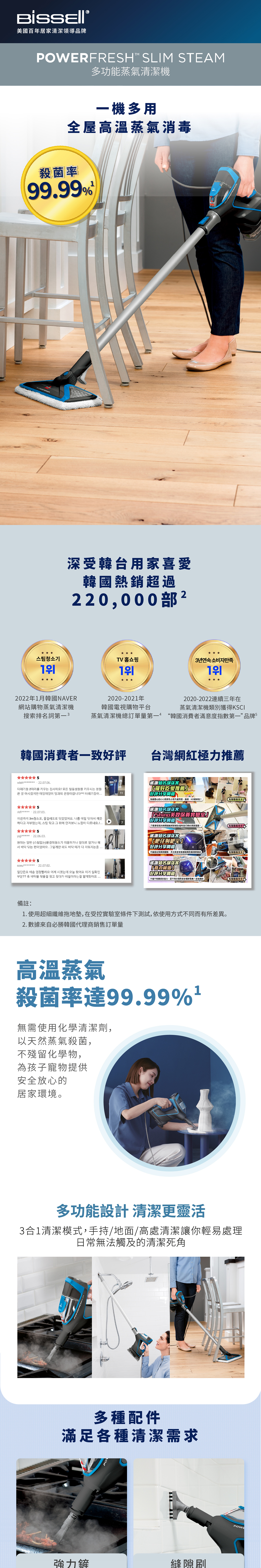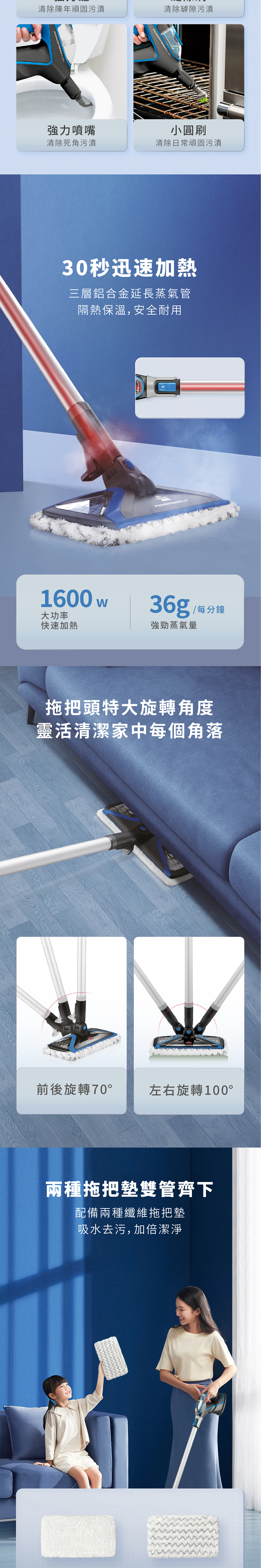 利用清水以高溫蒸氣消毒,無需加入化學清潔劑,殺菌率可以達到99.99%,為孩子寵物提供安全放心的居家環境 • 三合一清潔模式,手持/地面/高處清潔,輕易處理日常無法觸及的死角 • 附有多種配件,滿足各種清潔需求 • 30秒迅速加熱,每分鐘36g強勁蒸氣量 • 操作簡易,兩段蒸氣模式隨時切換