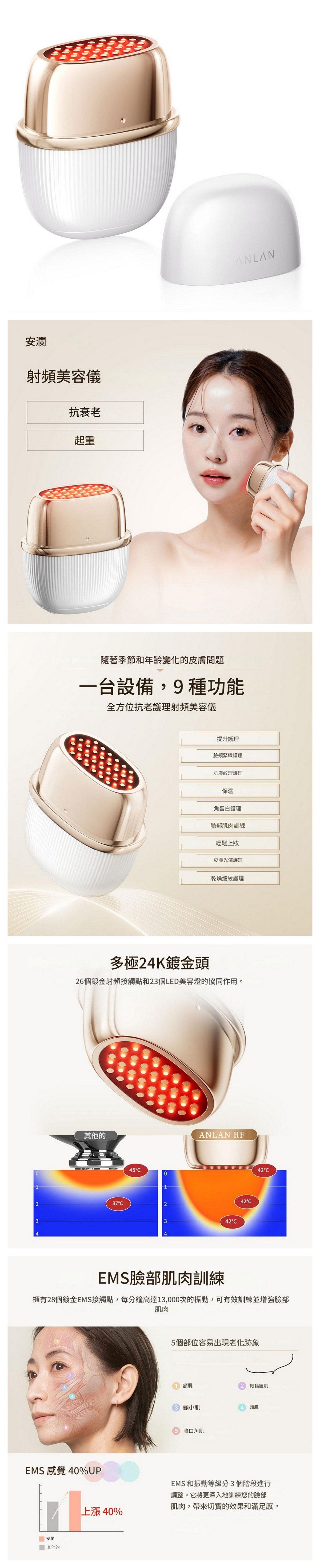 ADRY51-02A 黃金點陣射頻美容儀,結合28顆點陣探頭與23顆燈珠,採用鍍真金材質,能量聚焦深入真皮層,促進膠原蛋白增生。RF+EMS雙模式搭配紅、藍光療,有效緊緻提亮、平衡水油。三檔高頻震動活化肌膚,IPX6防水設計,使用更安心方便。