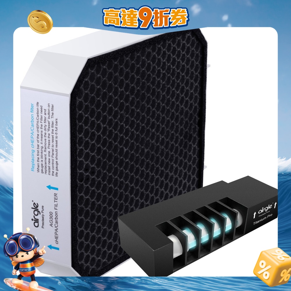 Airgle AG300濾網套裝內附「H14級cHEPA + 特級活性碳二合一濾網」及「Titanium Pro光觸媒UV殺菌組件」。
