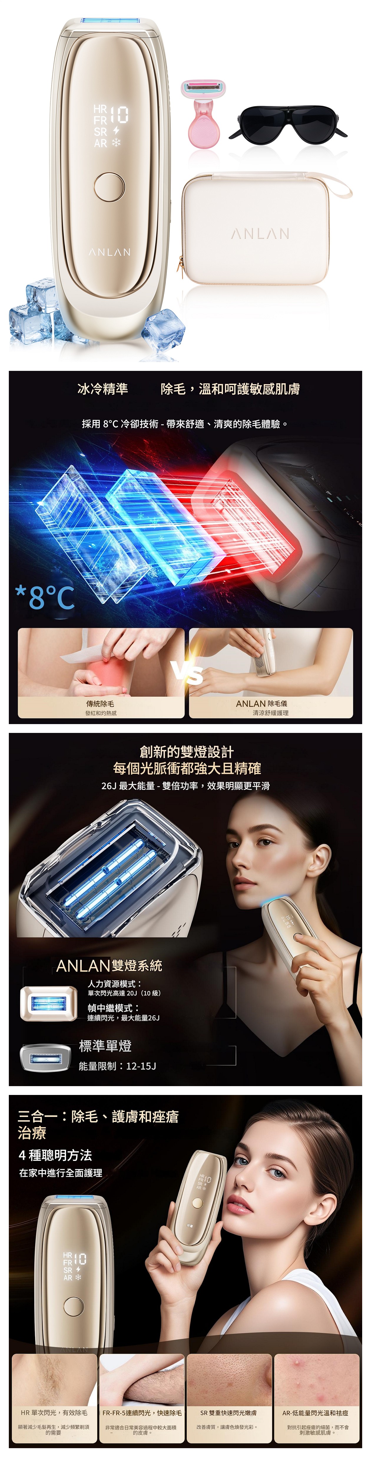 ATMY52-0RY 閃耀藍寶石脫毛儀集三大核心功能於一身:HR模式(650-1200nm)冰點脫毛、SR模式(550-650nm)光子嫩膚、AR模式(500-600nm)祛痘平膚。搭配雙通風、藍寶石冰點與雙燈管技術,無痛不燙且高效破壞毛囊黑色素;支援自動連閃(大面積)與手動出光(小敏感區),更搭智能IGBT晶片,FR模式快速出光,輕鬆兼顧舒適與效率。