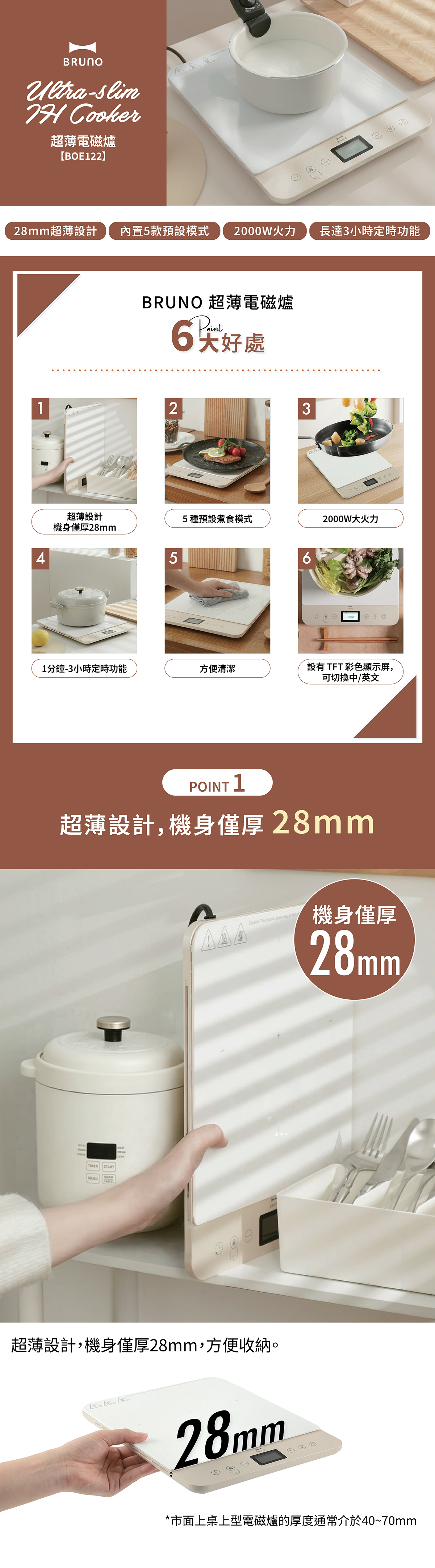 機身厚度僅約 28 毫米,設計輕巧且節省空間,方便收納與使用/搭載 5 種預設煮食模式,包括煎烤、火鍋、熱奶、手動溫度及火力調節模式,滿足多樣化烹飪需求/提供 10 段火力調節(200W 至 2000W)及 9 段溫度控制(60°C 至 220°C),實現精準火候掌控/具備 1 分鐘至 3 小時的智能定時功能,並設有 TFT 彩色顯示屏清晰顯示剩餘時間/內置安全裝置,包括安全鎖功能、機身過熱保護(E2 顯示)及自動斷電功能,全方位保障廚房安全
