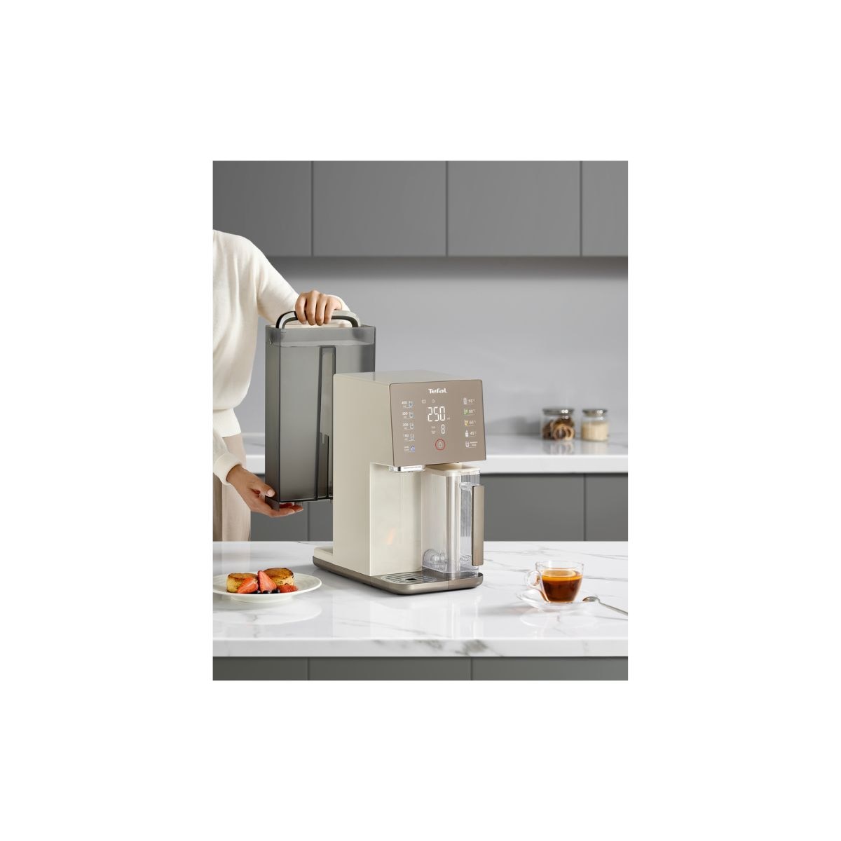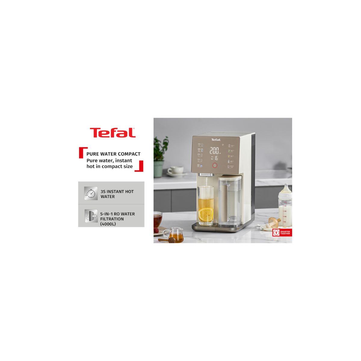 Tefal RO座檯式純淨水機, 可調較水溫: 室溫, 45°C - 95°C, 可調較水量:(150毫升, 200毫升, 250毫升, 300毫升, 350毫升, 400毫升, 450毫升, 500毫升), 5 合 1 逆向滲透淨化技術,可過濾 97 種有害物質.