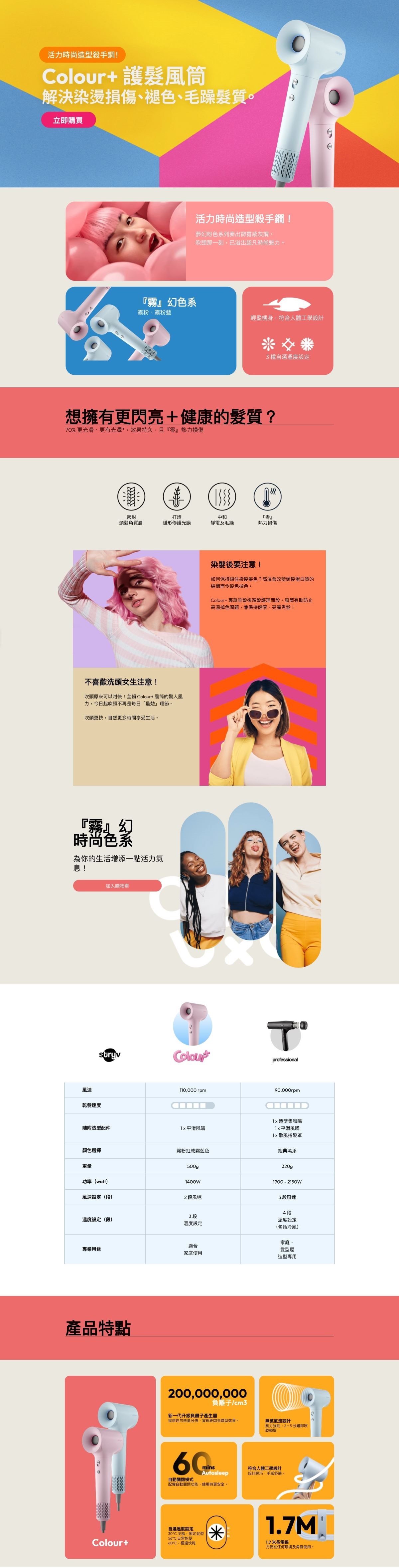 Colour+ 有 2 款『霧』幻色系選擇,適合所有髮質及髮型。配備 3 種自選溫度設定,以最大程度地減少造型過程中的過熱損傷。Colour+ 風力超級強大,配上超高速 10 萬轉風力,3 分鐘即可吹乾頭髮。另外,Colour+ 採用升級負離子技術,能有效減少毛躁及靜電,令頭髮倍添柔順、光澤。