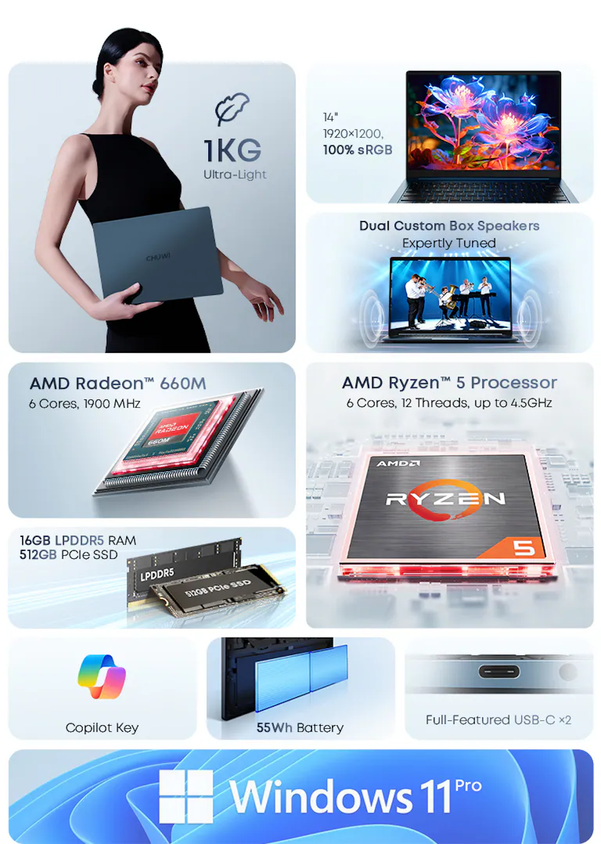 14.0" 1920*1200 16:10/ AMD Ryzen™ 5 6600H 6 core 12 threads/ AMD Radeon™ 660M/ 16GB LPDDR5 + 512GB SSD/ Wifi 6 (802.11ax1), BT5.2/ 55 Wh (11.55V/4700mAh)/ Windows 11 Pro