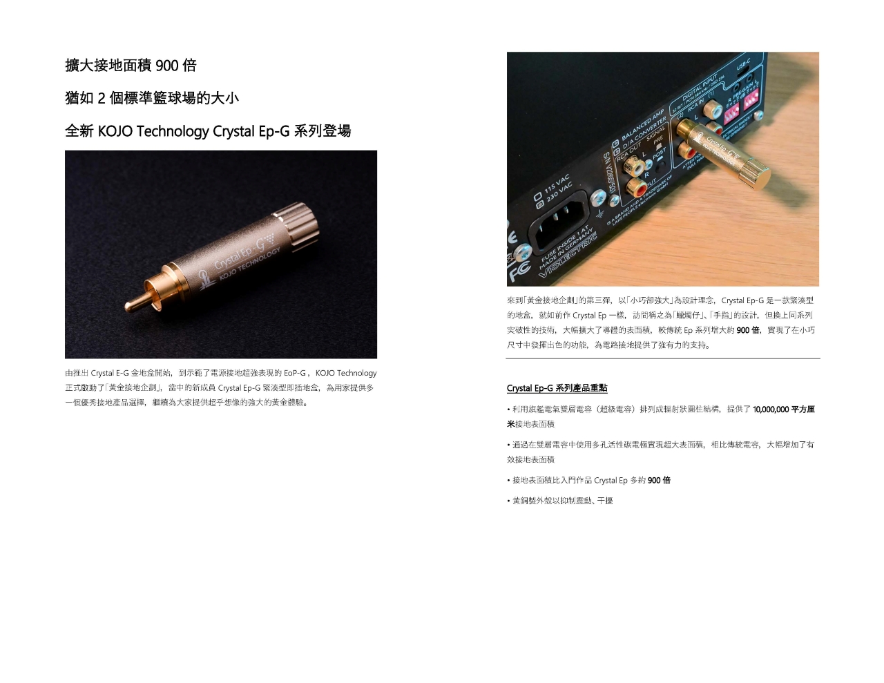 Crystal Ep-G 是一款緊湊型的地盒,就如前作 Crystal Ep 一樣,訪間稱之為「蠟燭仔」、「手指」的設計,但換上同系列突破性的技術,大幅擴大了導體的表面積,較傳統 Ep 系列增大約 900 倍,實現了在小巧尺寸中發揮出色的功能,為電路接地提供了強有力的支持。