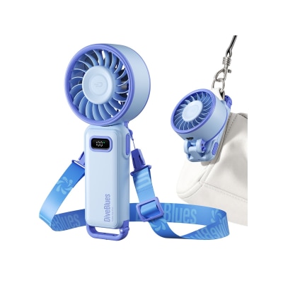 Diveblues 2026年最新推出可折疊手持 Fanzy 風扇,集合五種使用方法: 折疊、手持、座檯、掛頸、登山扣。旋轉角度 180°全折疊,風扇頭與機身50/50黃金比例,登山扣首創外開用法,輕鬆開合,風速 1 - 100 檔可調,風力高達 7.6 公尺/秒,續航力最多可用12小時,LED屏幕數字顯示,可同時查看風速和電量。八種不同顏色可選擇,容易配搭。