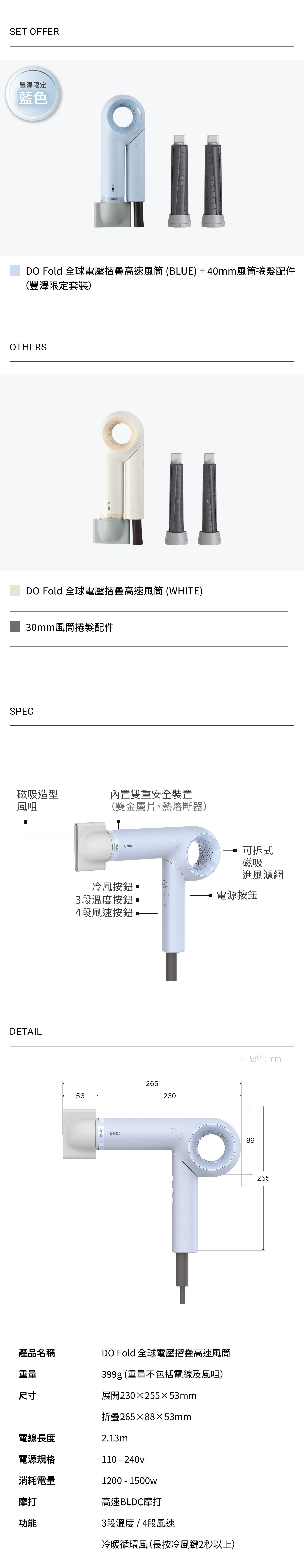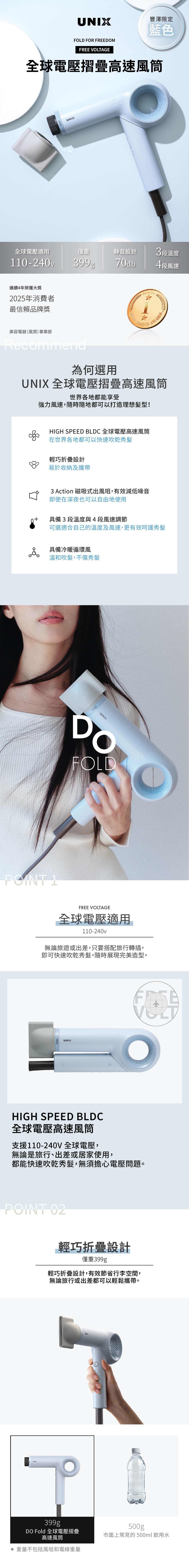 Unix DO FOLD 是韓國首創及韓國製的全球電壓高速風筒,創新的摺疊設計配以全球電壓,比一般酒店傳統的風筒更快速吹乾頭髮,在旅行時大大縮短乾髮時間,爭取更多體驗當地的機會。另外, 更貼心的可將捲髮配件(需另購) 加到風筒上,打造曲髮造型,為不同造型做好最佳準備