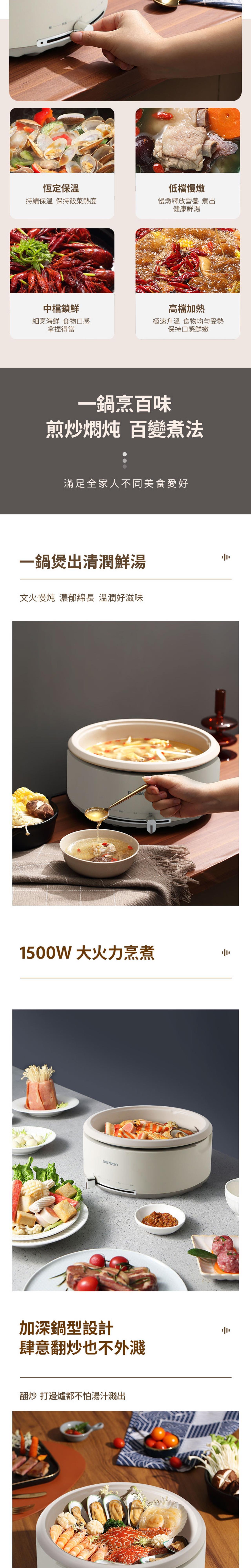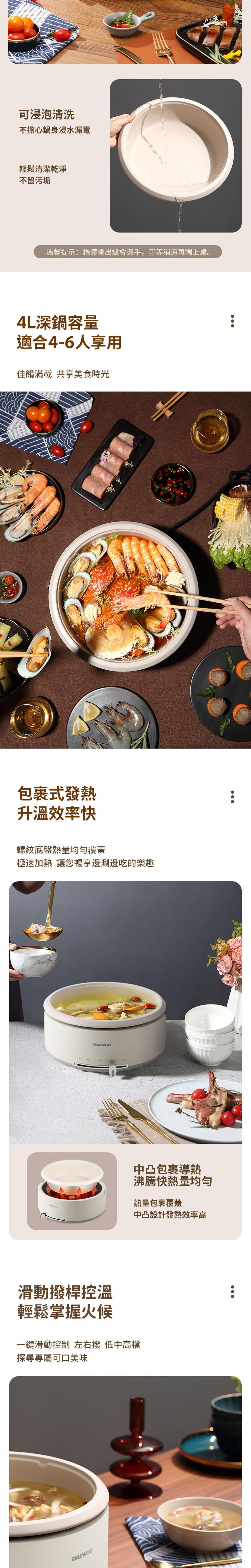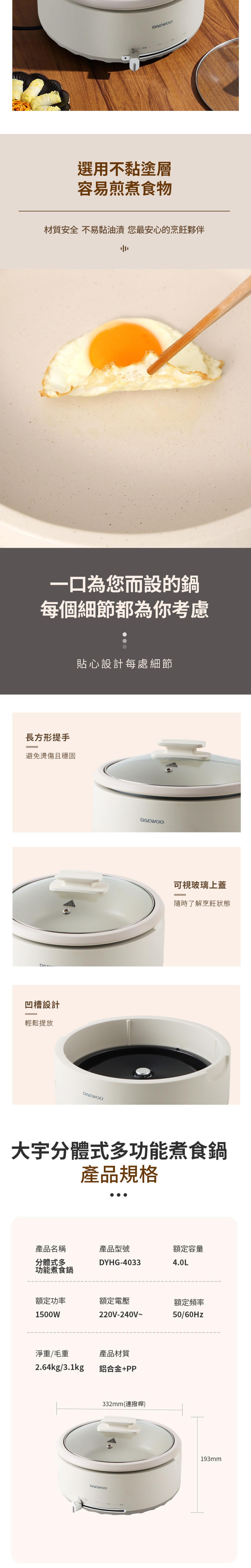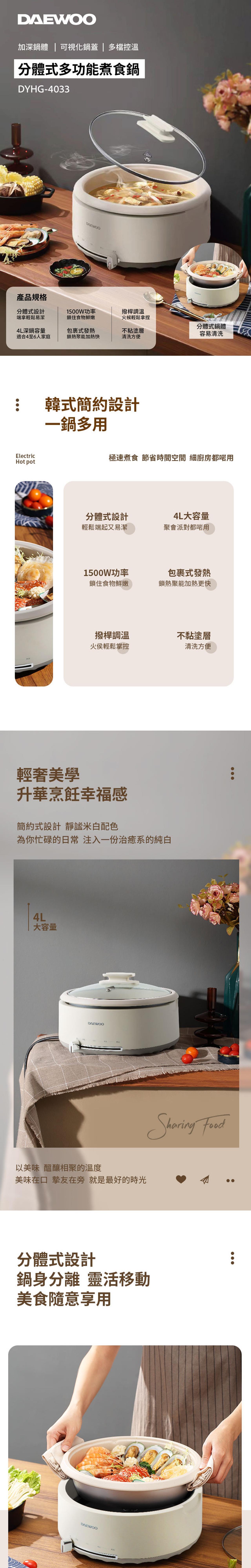 DAEWOO 新推出DYHG-4033 多功能煮食鍋,韓式簡約設計一鍋多用!1500W 聚能發熱盤,配合4L容量加深鍋體,翻炒都唔怕外濺,4-6人份量最適合家庭聚餐。分體式設計清洗超簡單,仲有可視化玻璃蓋同滑動調溫,煮食更方便輕鬆。打邊爐、煎炒炆煮都得,是家庭必備的料理好幫手!
