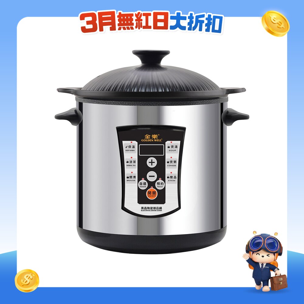 容量: 6 公升 自動烹調程式數目: 6 程式: 煲湯、涼茶、滾湯、燉品、燜煮、保溫 預校烹調時間功能: 有 功率: 900瓦 體積: 320 x 270 x 355 毫米 配備黑晶陶瓷內膽連蓋 三年保養