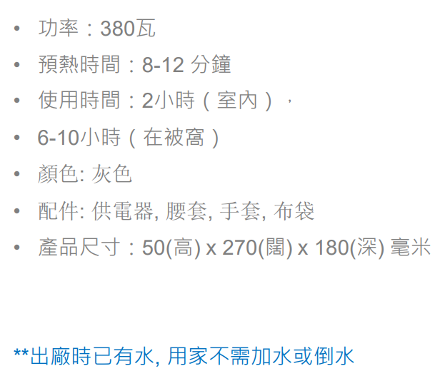 預熱時間:8-12 分鐘。功率:380瓦。使用時間:2小時(室內),6-10小時(在被窩)。配件: 供電器, 腰套, 手套, 布袋。