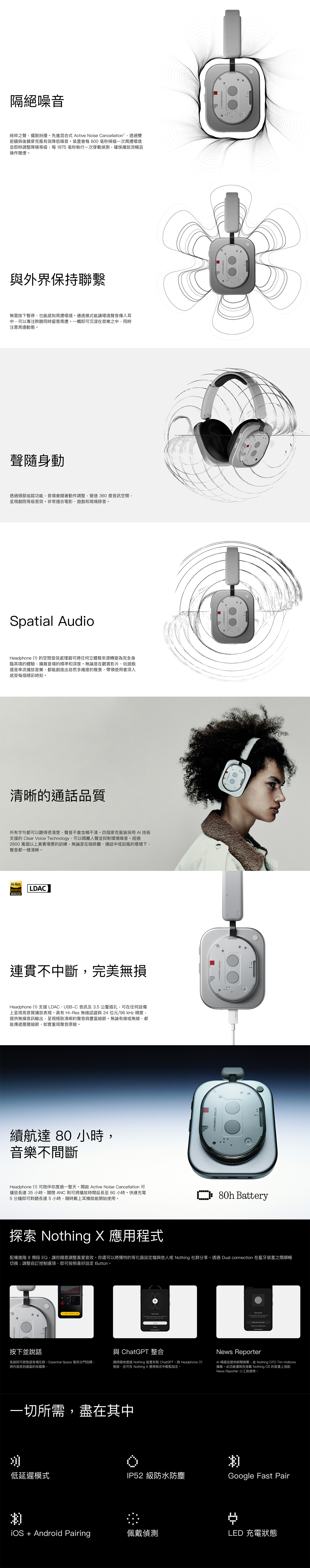 定製 40mm 驅動單元配合鍍鎳塗層隔膜 / 與 KEF 聯合聲學調校,精確且平衡 / 實時自適應主動降噪及通透模式 / Spatial Audio 空間音訊支援頭部追蹤 / 最長可達 80 小時音樂播放
