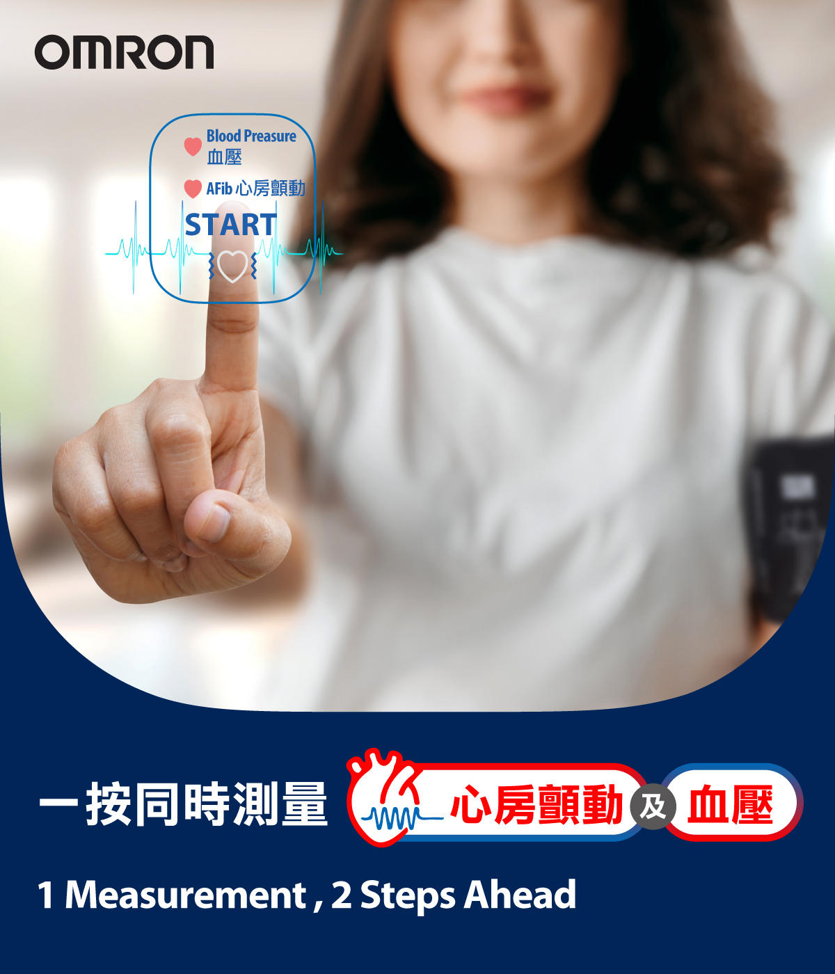 歐姆龍 HEM-7383T1-在家量血壓同時篩查心房顫動。只需一按即可同時測量血壓及心房顫動(AFib)的可能性。多功能健康監測,包括血壓偏高提示和心律不齊檢測等。