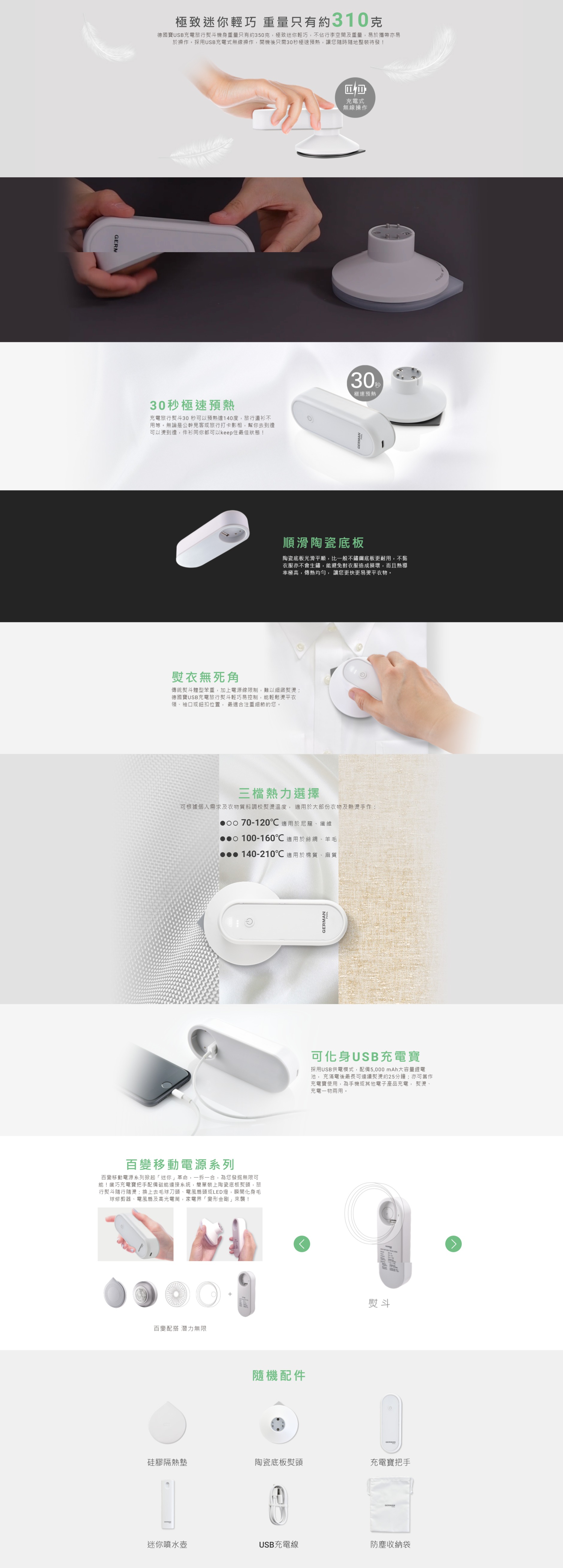 簡單一鍵操作,30秒極速預熱,三檔熱度選擇,可熨燙不同類型物料,可分拆式掌上型設計,迷你便攜,USB充電,可無線使用