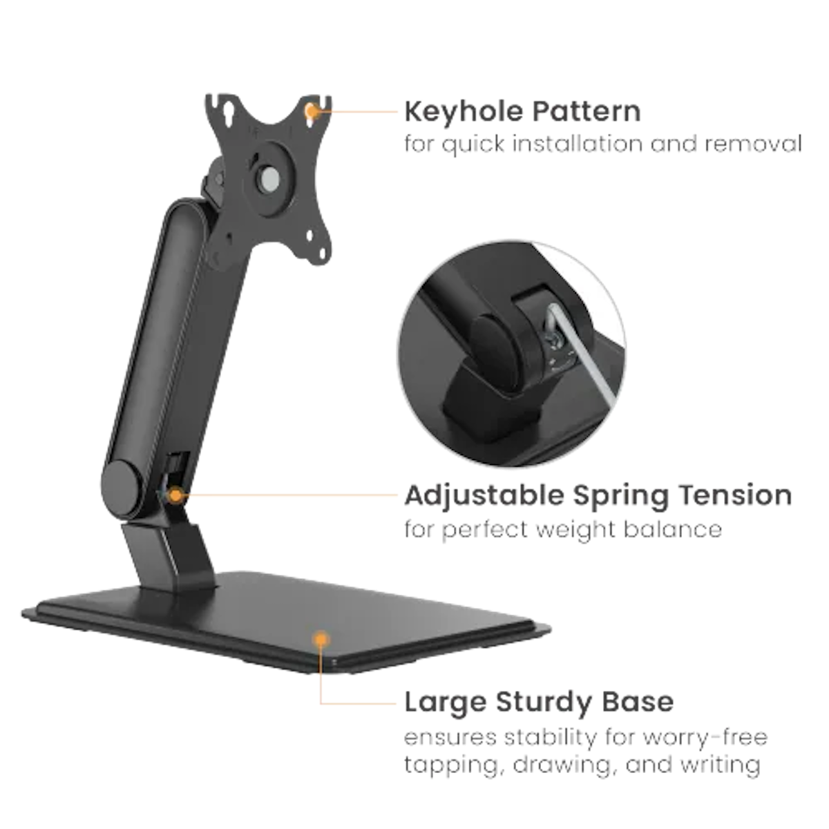 Free-Tilting Design, move forward or backward easily/Height Adjustable, for better viewing position/Built-in Spring Tension Mechanism/Keyhole Pattern to allows for easy installation/Fit monitor 17" - 32" (Flat / Curved)