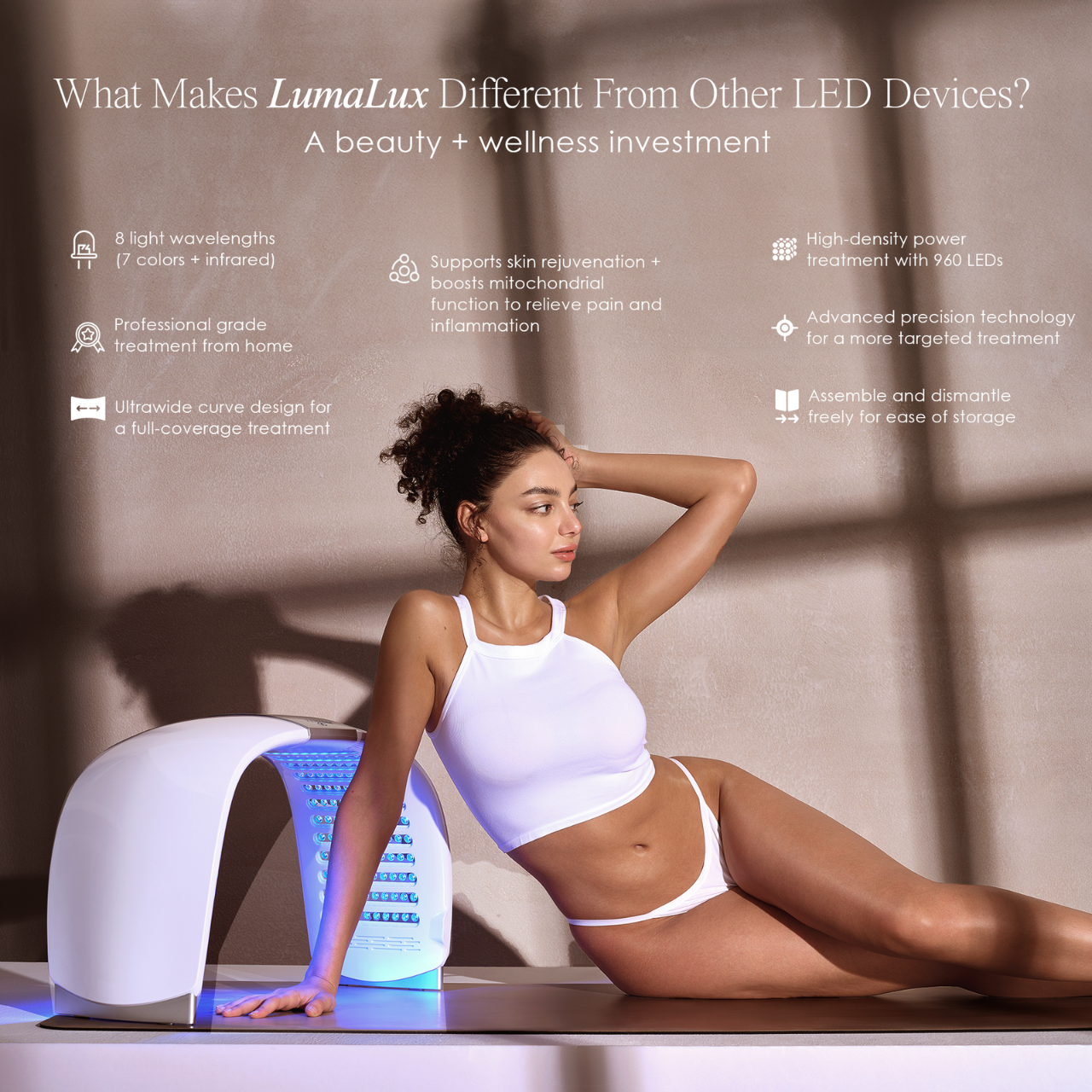 LumaLux Dome 專業全身光療美容儀經過專業光學透鏡設計,光源集中均勻分布,360度無死角全面護膚,全身適用。具有7 種LED 光顏色,加上近紅外線 (830 nm),針對性解決皮膚問題。美容儀採用先進的彎曲技術,實現均勻的光分佈,960 顆高能量燈芯 排列在超寬曲線設計上,以確保目標細胞使用最大程度地吸收光,以獲得最佳結果。