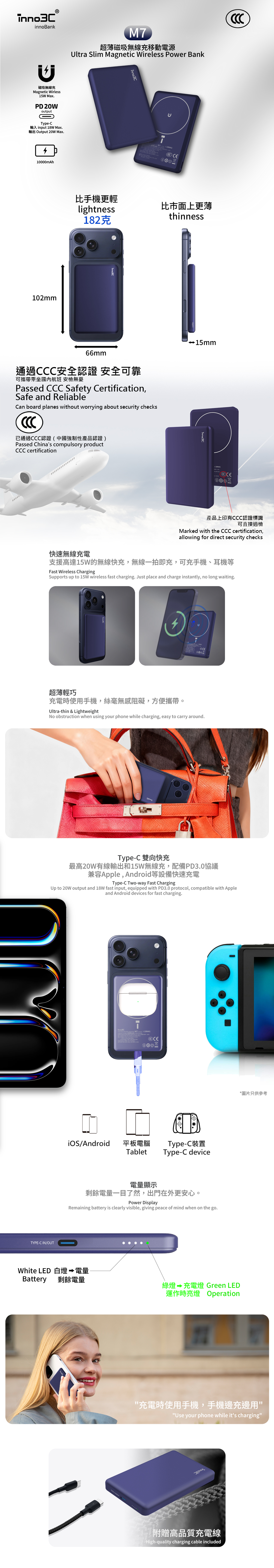 通過CCC與CE認證的10000mAh超薄移動電源,支援15W無線快充與Type-C PD3.0雙向快充,兼容多設備充電;磁吸設計穩固不脫落,可同時無線有線輸出;多重防護確保安全。