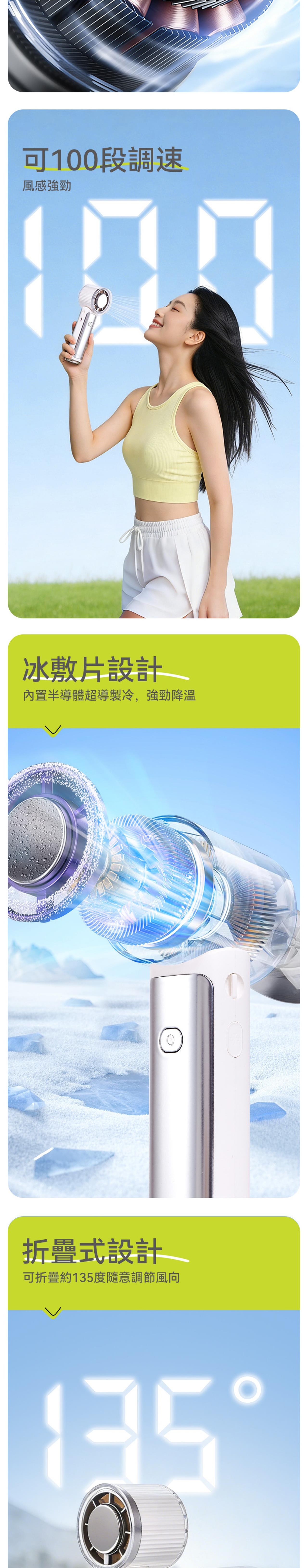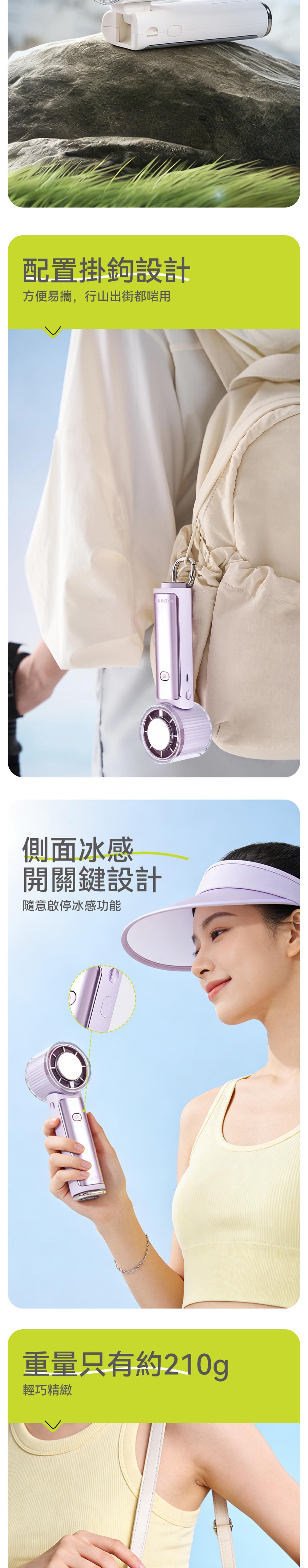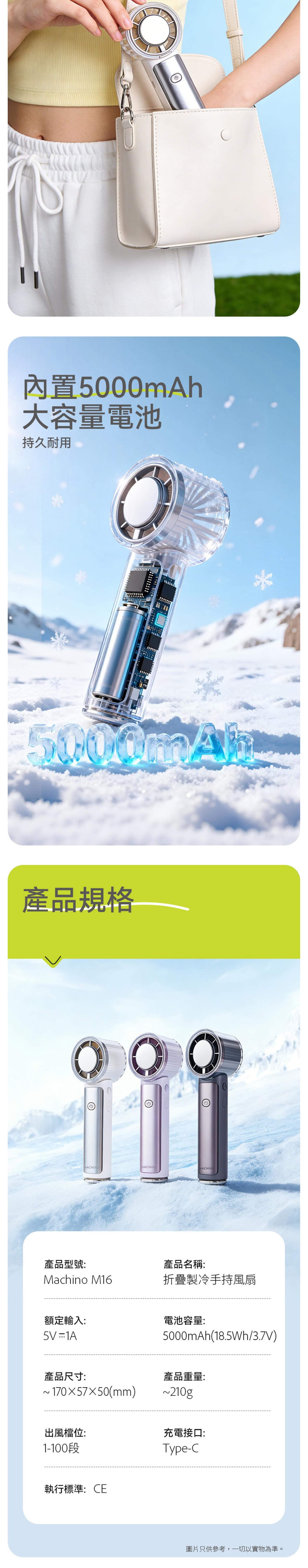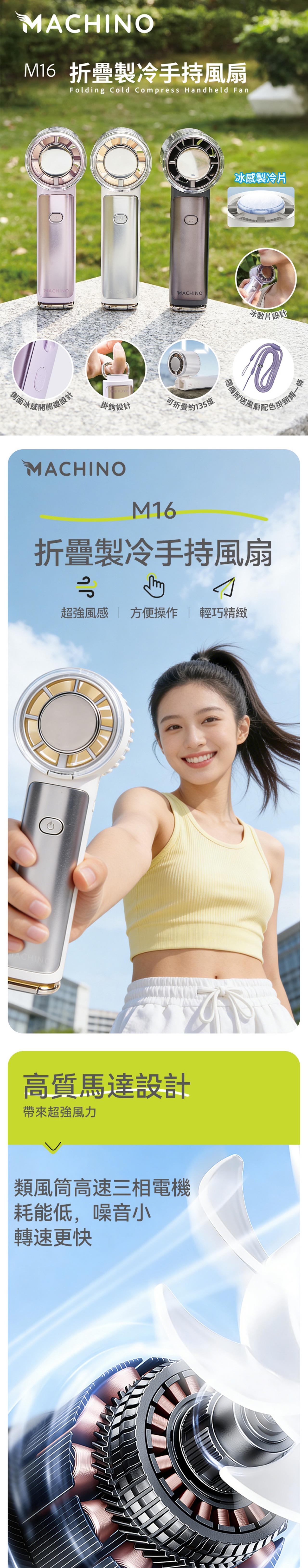 Machino 最新推出的M16折疊製冷手持風扇,具備強大冷卻效果! 結合高質馬達設計+100 段調速+冰敷片製冷設計,三重功能高效降溫,為您帶來強風及冰涼體驗。風扇僅有約210g超輕盈重量,內置5000mAh的大容量電池,使用時間更持久。底部掛鉤+135度可折疊式設計+ 配備頸繩更方便易攜,可靈活切換手持、坐枱或掛頸模式,在炎炎夏日為您隨時享受涼風吹拂,是今個夏天必備風扇首選。