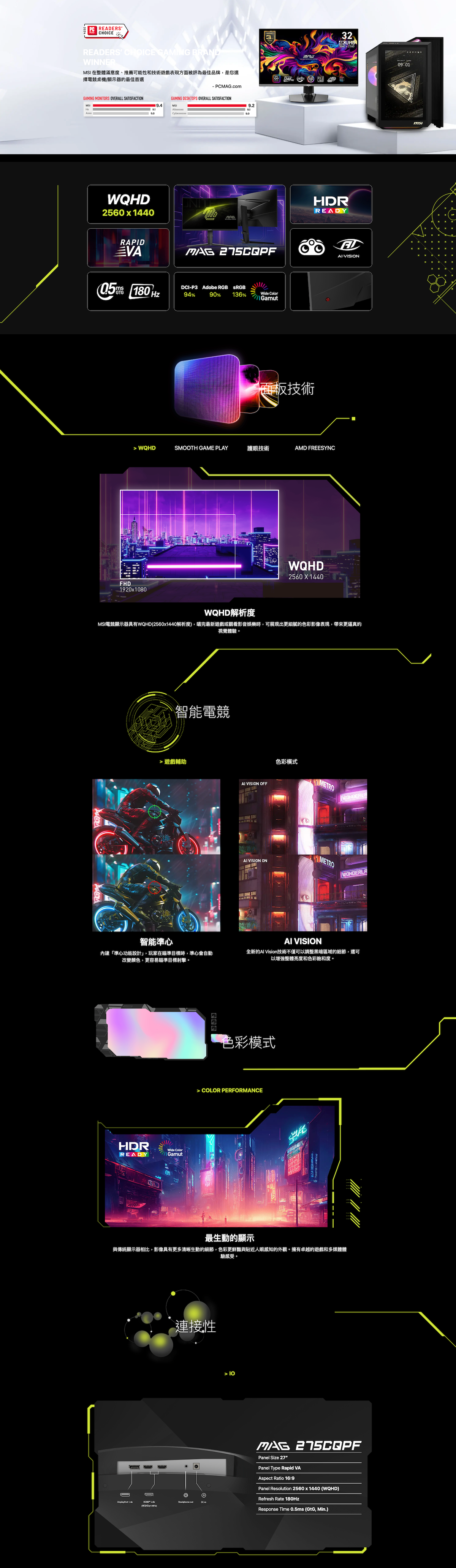 MSI 微星 MAG 275CQPF 27" 2K 180Hz 曲面 電競顯示屏