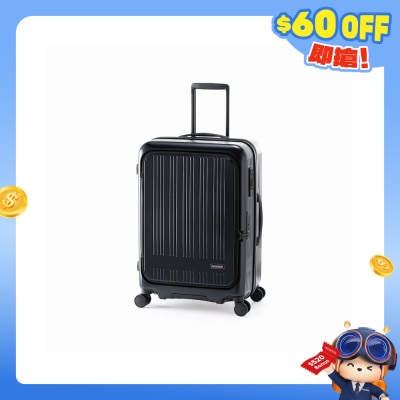 前蓋可擴充行李箱 ,方便裝卸行李。 配有兩種隔板,方便行李分類。 配備四組雙輪和自家刹車鎖,鎖住的時候也能單靠後方車輪移動。ALI獨創開關,一觸即可鎖定和解鎖。開關置於上側,方便操作。 多段手柄易於調節。 採用不易破損的YKK拉鍊。配備TSA 鎖(數字式)