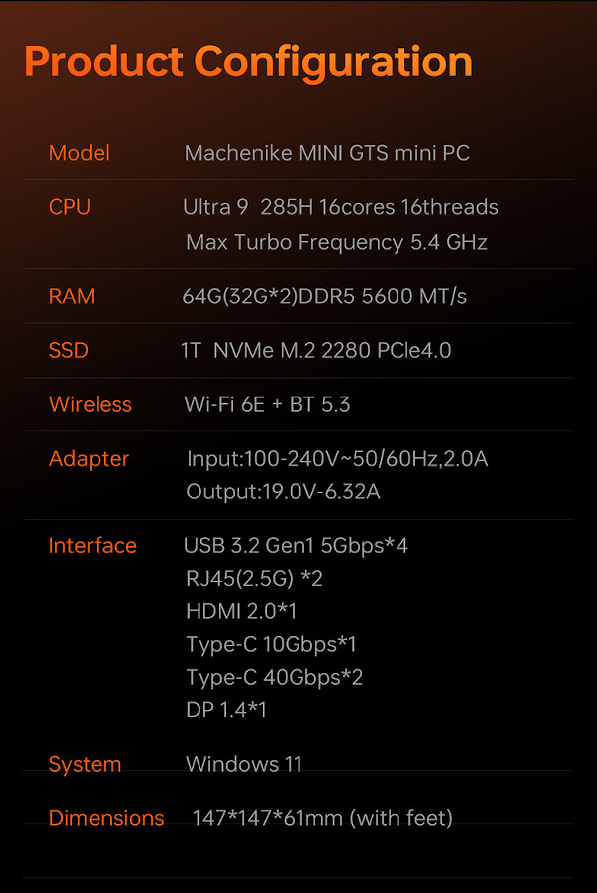Mini GTS/Intel U9-285H/ 64G /1T/Windos 11 Pro/16核超強多工性能/DDR5 64GB特大容量配上新一代高速RAM/專屬智慧屏/2年保養