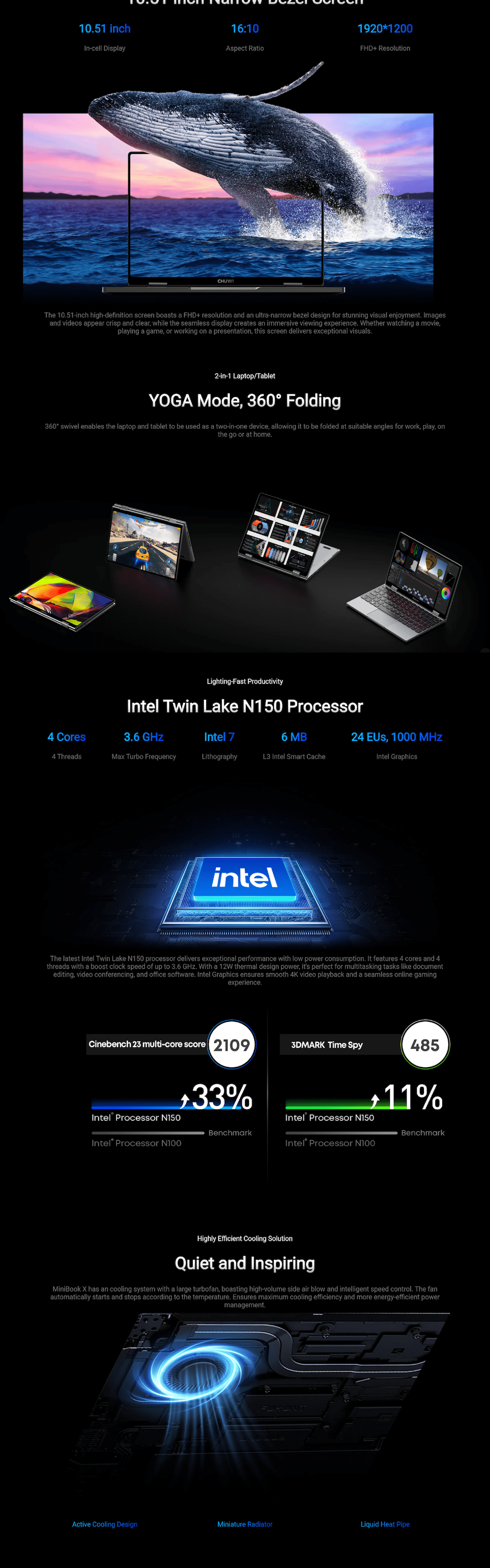 Yoga & Touch Screen/10.51" 1200*1920, 16:10 IPS/Intel Processor N150 with Intel® Graphics/16GB RAM + 512GB SSD/WIFI6(802.11ax1), BT5.2/28.88Wh (7.6V/3800mAh)/Windows 11 Home