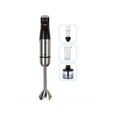 手提攪拌機,單手操作,同時變速,備安全鎖,放心易用,具速度顯示燈,觸感式多段速度按鈕,人體工程學設計手柄,一機多用,集合攪拌、切碎、切絲、磨茸、打蛋、等多種功能 配件齊備:攪拌棒、碎肉器(600毫升)、雙頭打蛋器、攪拌杯(800毫升)