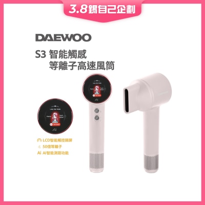 韓國大宇最新推出的S3等離子高速風筒,高濃度等離子高達約50億,全面消除頭髮靜電及毛躁,形成水膜護髪,智能握感啓停功能,握感啓動,放低自動停機,助您安心造型。創新LCD智能觸控顯屏設計,共七種炫彩模式: 恆溫、智能、兒童、長髮、短髮、寵物、冷熱交替等七種模式,更備有3種風溫+2檔風速調節,110000rpm帶來強勁風力,加上NTC智能溫控技術及AI智能測距功能,同時速乾護髮,是市埸上最全面的等離子風筒。