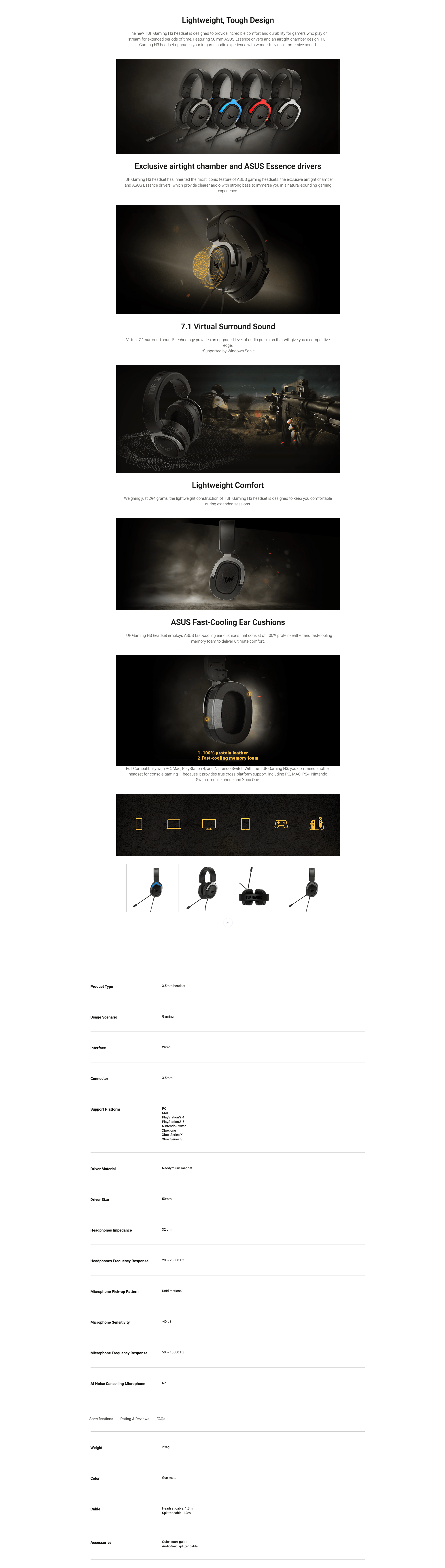 TUF Gaming H3 電競耳機具備 7.1 環繞音效、渾厚低音、輕量設計、極速冷卻耳罩,適用於PC、PS4、Xbox One 及 任天堂 Switch