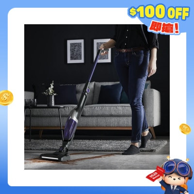 創新設計二合一無線吸塵機,高速吸頭,雙向可屈曲手把設計,備有前置LED燈可在光線不足的環境下工作,羽量設計,可連續使用40分鐘(節能手提模式),2段自動吸力調節(節能手提/節能直立模式),強效吸力按鈕,有效過濾塵埃達99%,高效旋風式塵埃分離技術,16.8V鋰離子電池*,集塵量0.4升,獨立站立功能,折疊手柄方便存放
