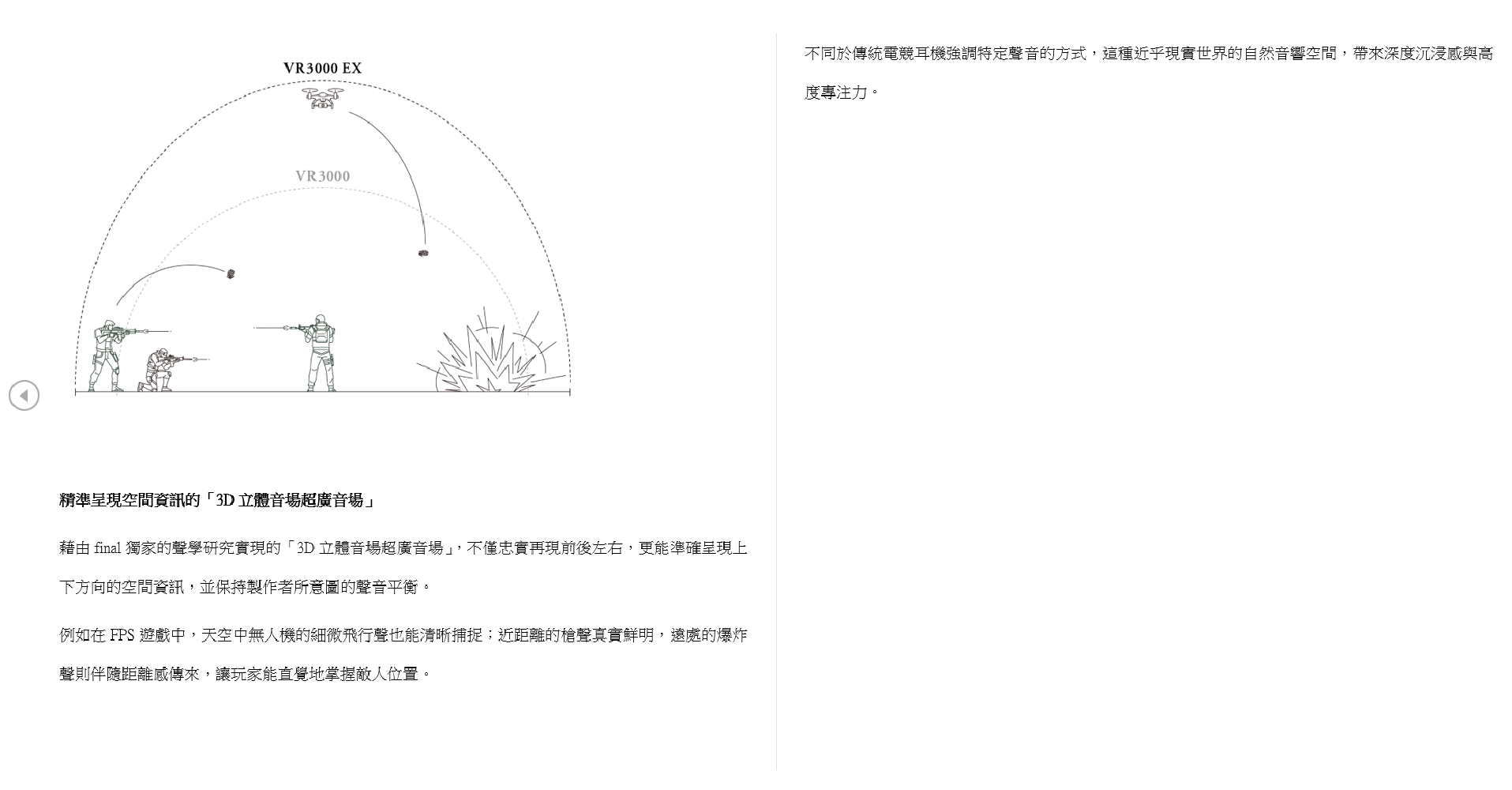 電競聲學再進化!final推出頭戴式無線電競耳機 VR3000EX,實現超廣3D聲學空間及超低延遲,助你以聲制勝! 以聲制勝,主宰戰局 — 為「勝利」而誕生的電競耳機, 透過忠實重現遊戲與內容的「3D立體音場超廣音場」,帶來深度沉浸感與高度專注力。搭載「腳步聲模式」,能迅速掌握敵人位置,FPS遊戲最佳利器。