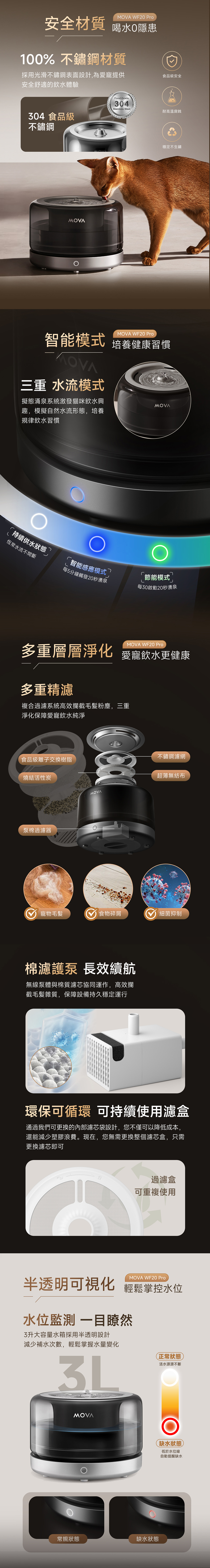 多層過濾系統、100% 不鏽鋼濾板、可重複使用環保濾盒、水電分離設計、動態活水循環