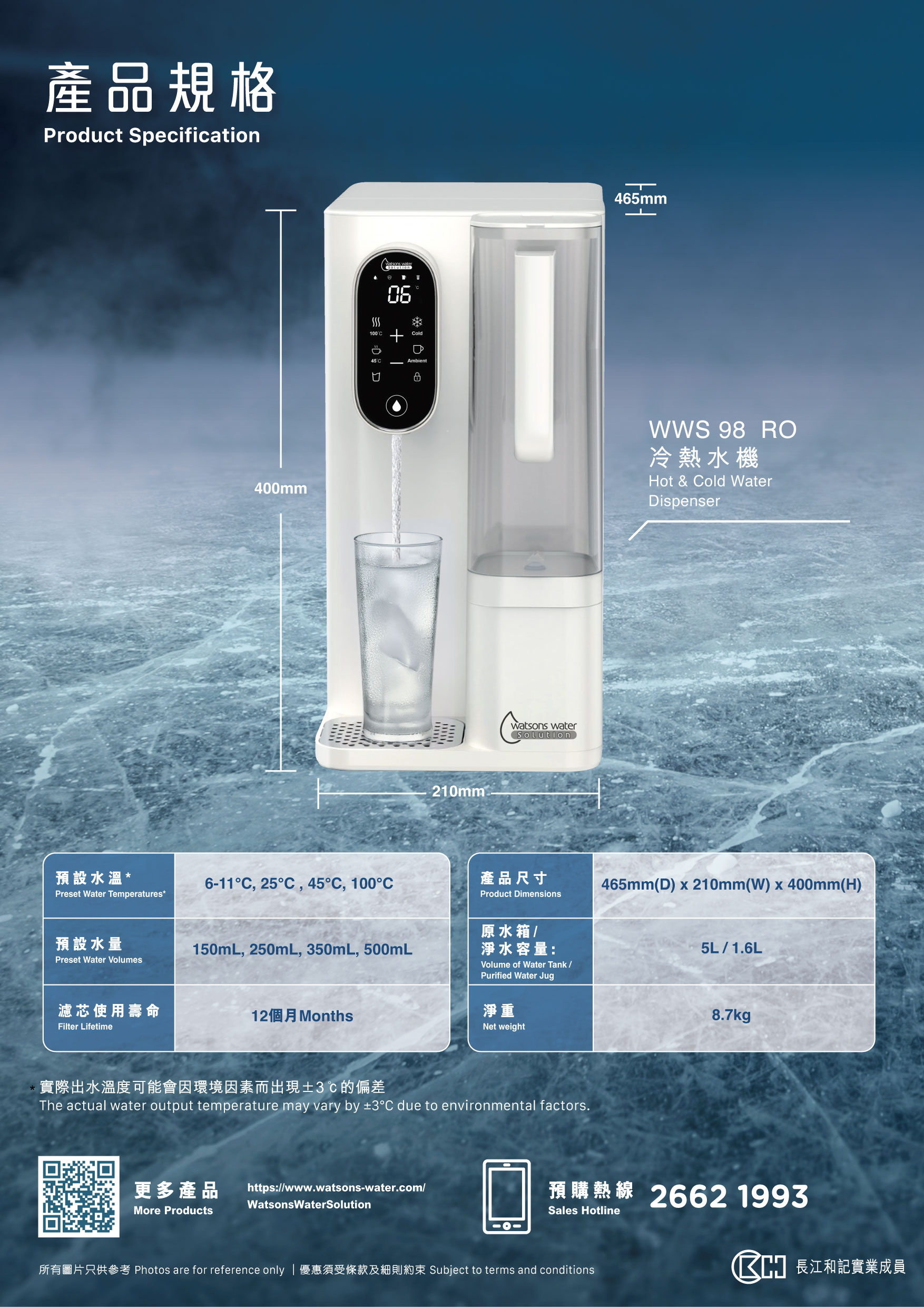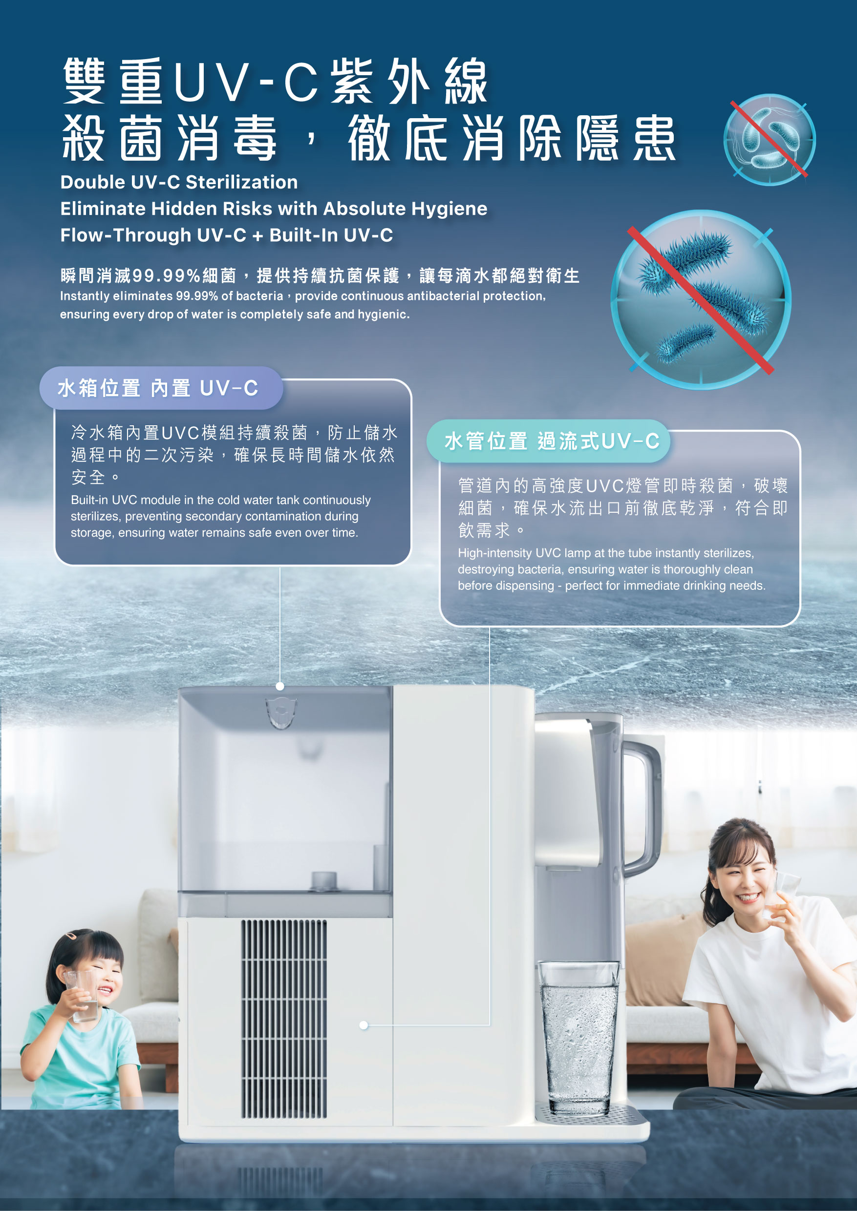 5層深濾 極致淨化 - 有效去除小至0.0001微米的有害物質;雙重UVC紫外線,瞬間消滅99.99%細菌,提供持續抗菌保護;4檔預設溫度 + 自由調溫;免安裝一插即用。