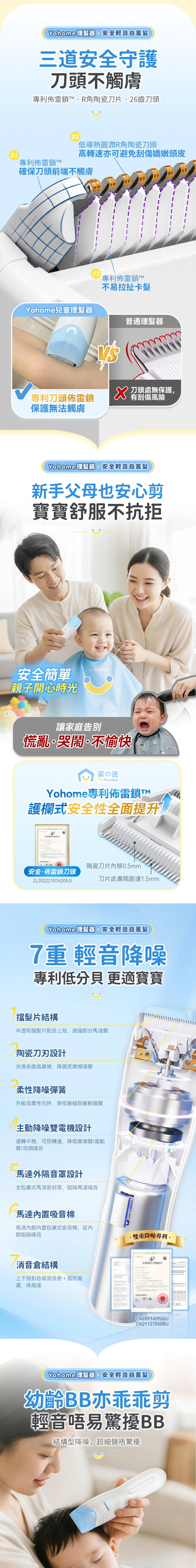 1. 護欄式防觸膚+陶瓷低導熱+26齒密齒,不刮不燙不拉髮;2. 音噪低至50dB,不吓娃;3. 前吸後蓄不飛髮;4. 雙電機強吸不卡髮;5. IPX7全機防水可沖洗;6. 輕巧整機僅198g;7. 無線USB充電;8. 從胎髮到碎髮全齡都適用;9. 多項認證更安心:通過 CE / ROHS / IPX7 防水測試